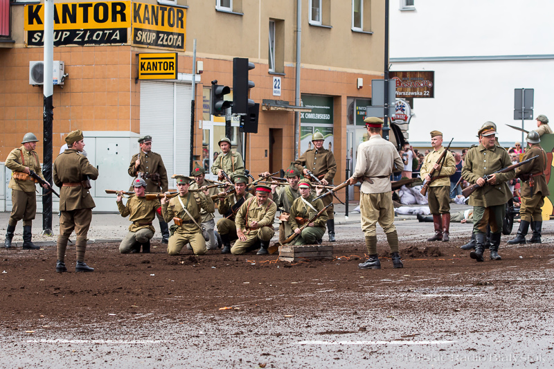 Niedzielna inscenizacja, z efektami pirotechnicznymi i dźwiękowymi, została przygotowana na skrzyżowaniu ulicy Pałacowej i Warszawskiej, które od wczesnego rana było zamknięte dla ruchu. Według scenariusza przygotowanego na podstawie materiałów archiwalnych, maszerująca piechota bolszewicka natknęła się tam na oddział legionistów. Doszło do ostrzału, a potem walki wręcz, również z udziałem cywilów, sprzyjających zarówno Polakom, jak i bolszewikom.