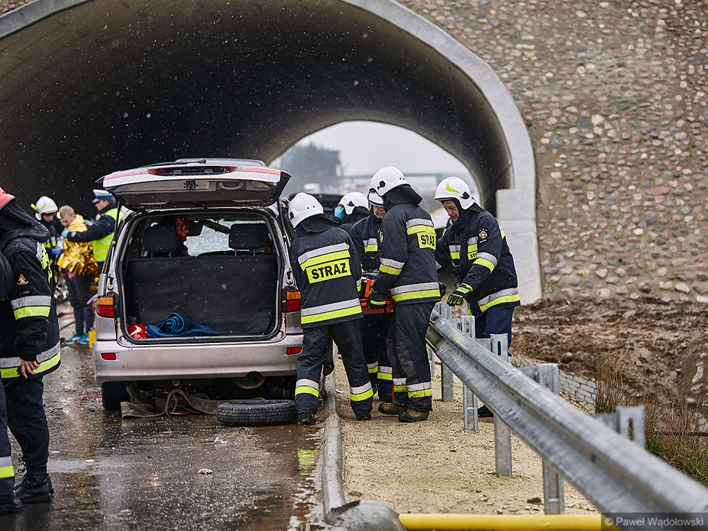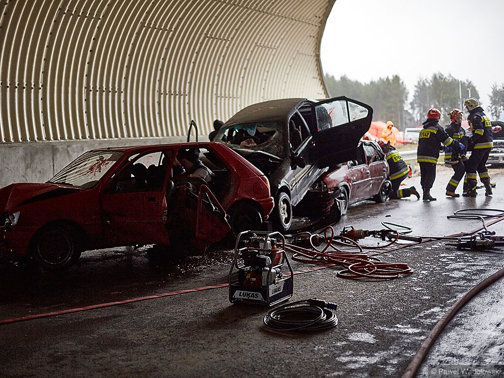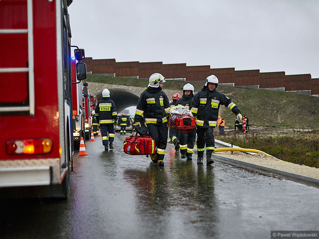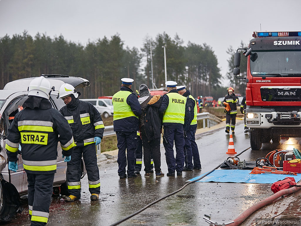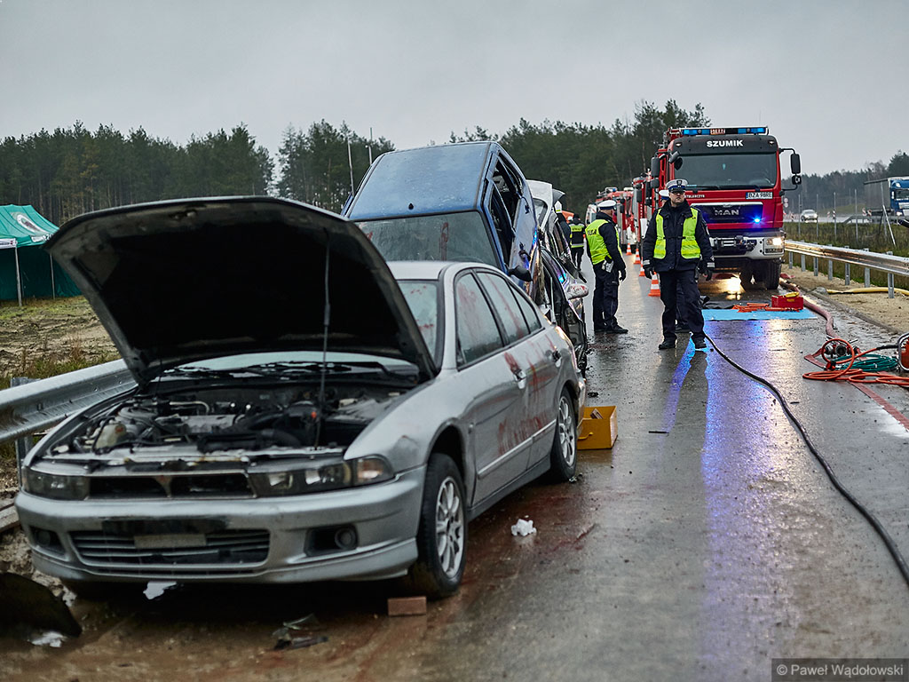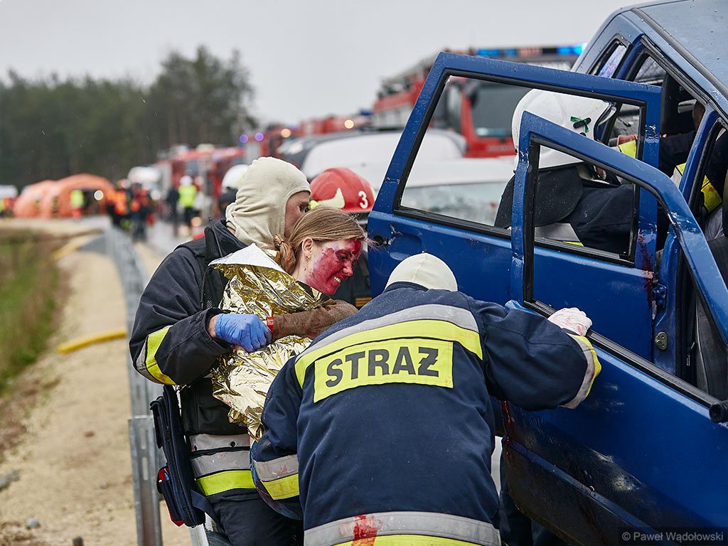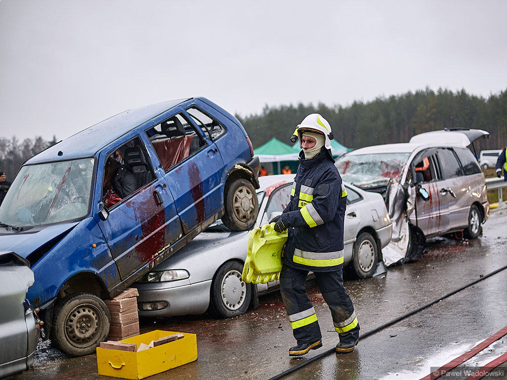 Karambol na drodze ekspresowej, w którym bierze udział 7 samochodów i rannych jest kilkadziesiąt osób - taki scenariusz ćwiczyli w poniedziałek (14.11) podlascy strażacy, policjanci i ratownicy na drodze S8 koło Szumowa.