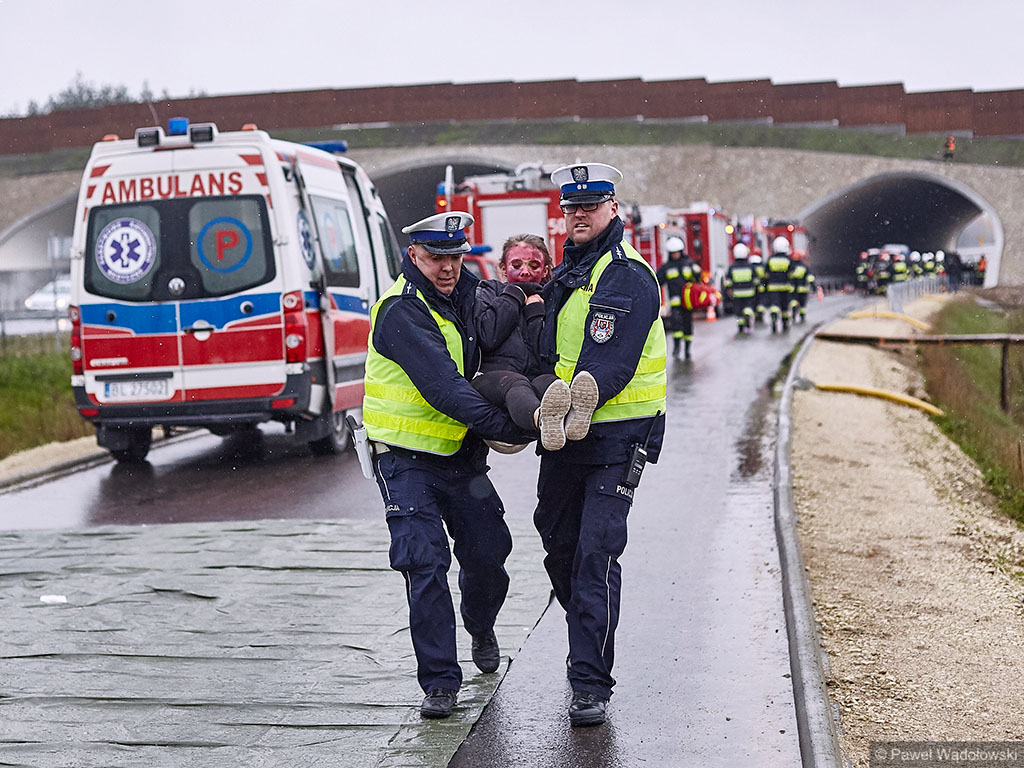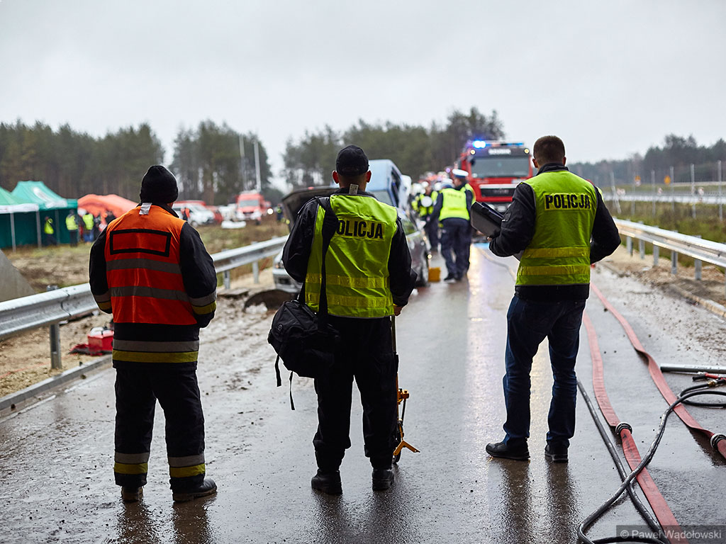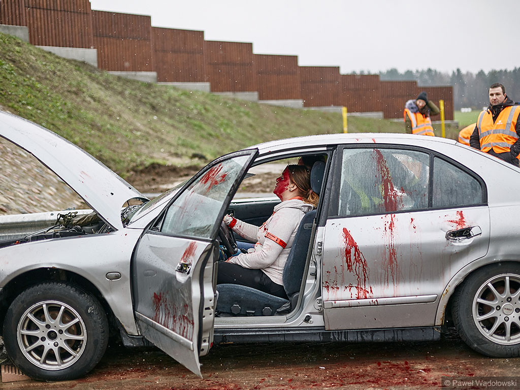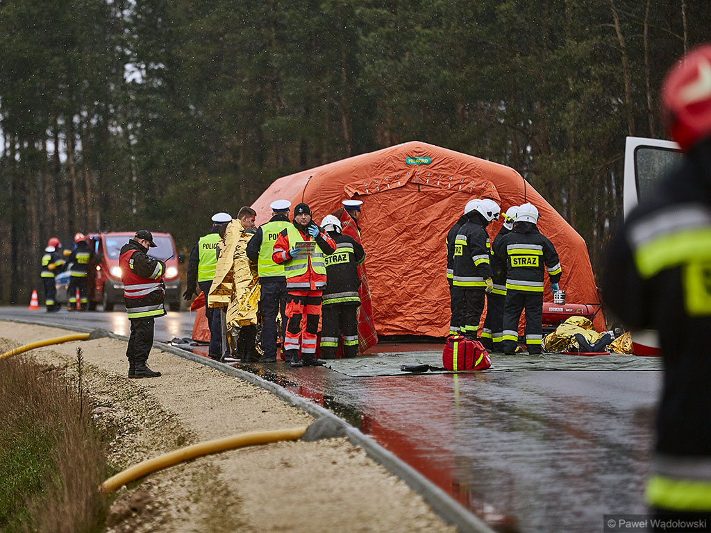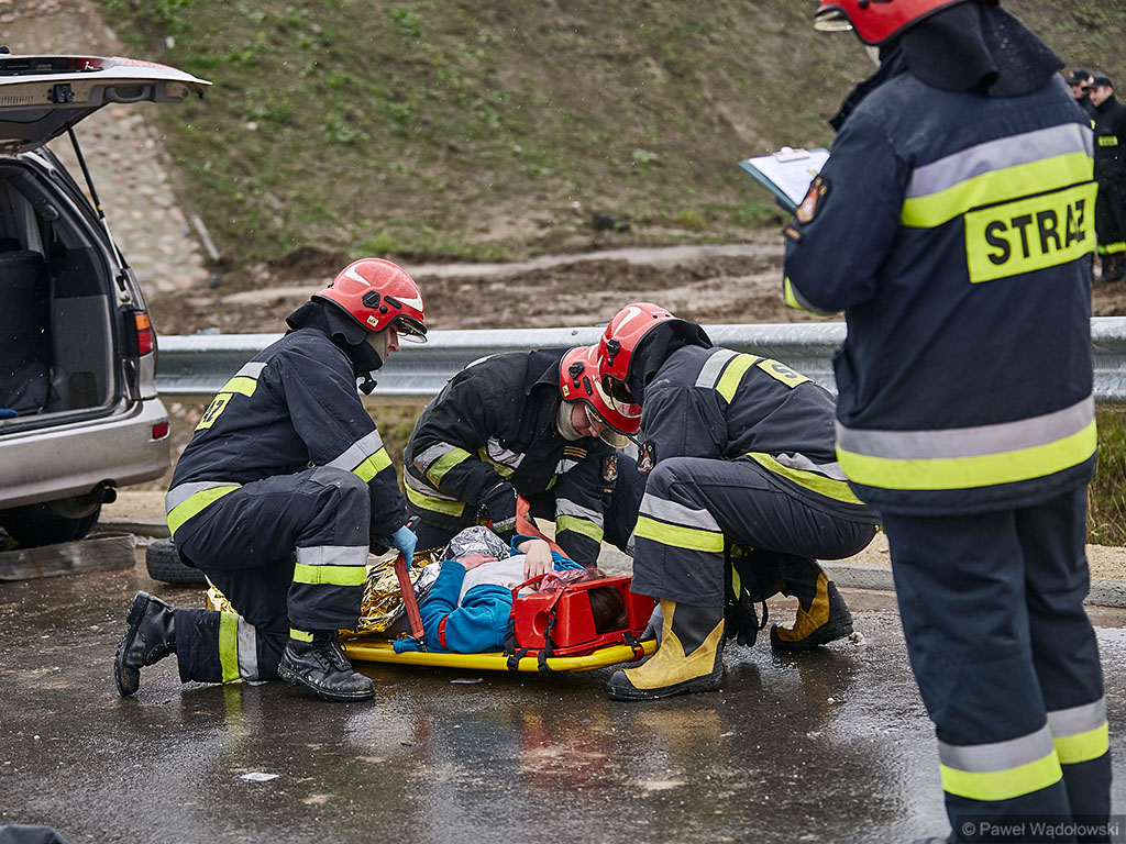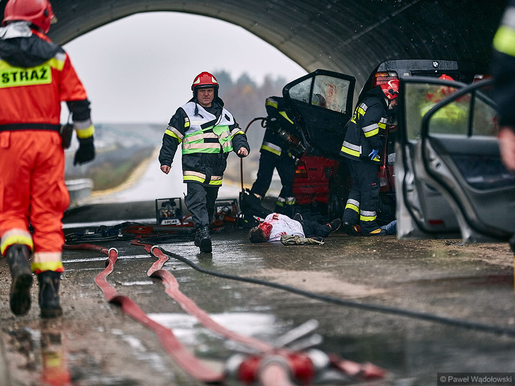 Karambol na drodze ekspresowej, w którym bierze udział 7 samochodów i rannych jest kilkadziesiąt osób - taki scenariusz ćwiczyli w poniedziałek (14.11) podlascy strażacy, policjanci i ratownicy na drodze S8 koło Szumowa.