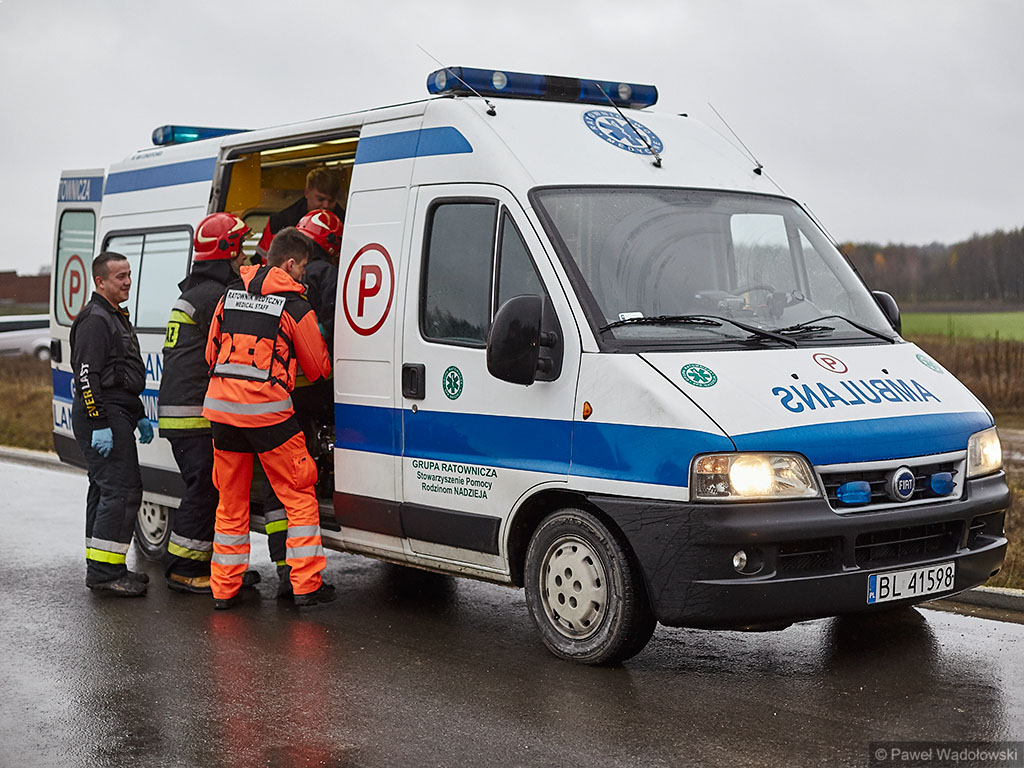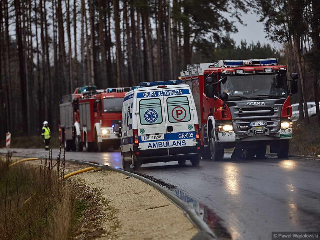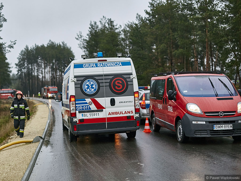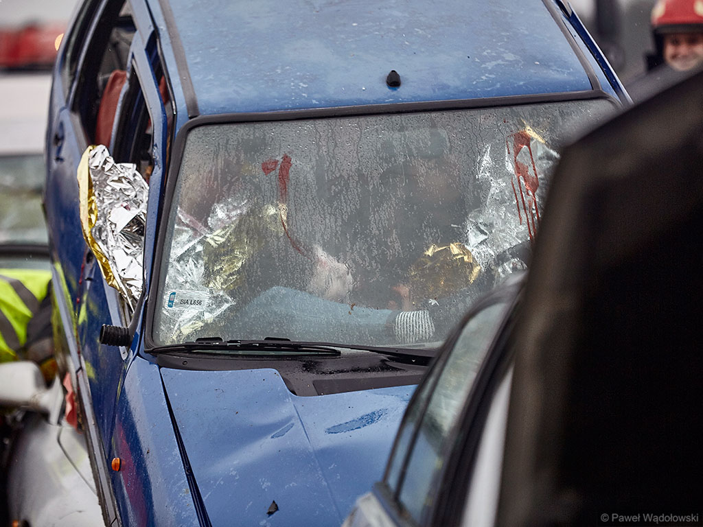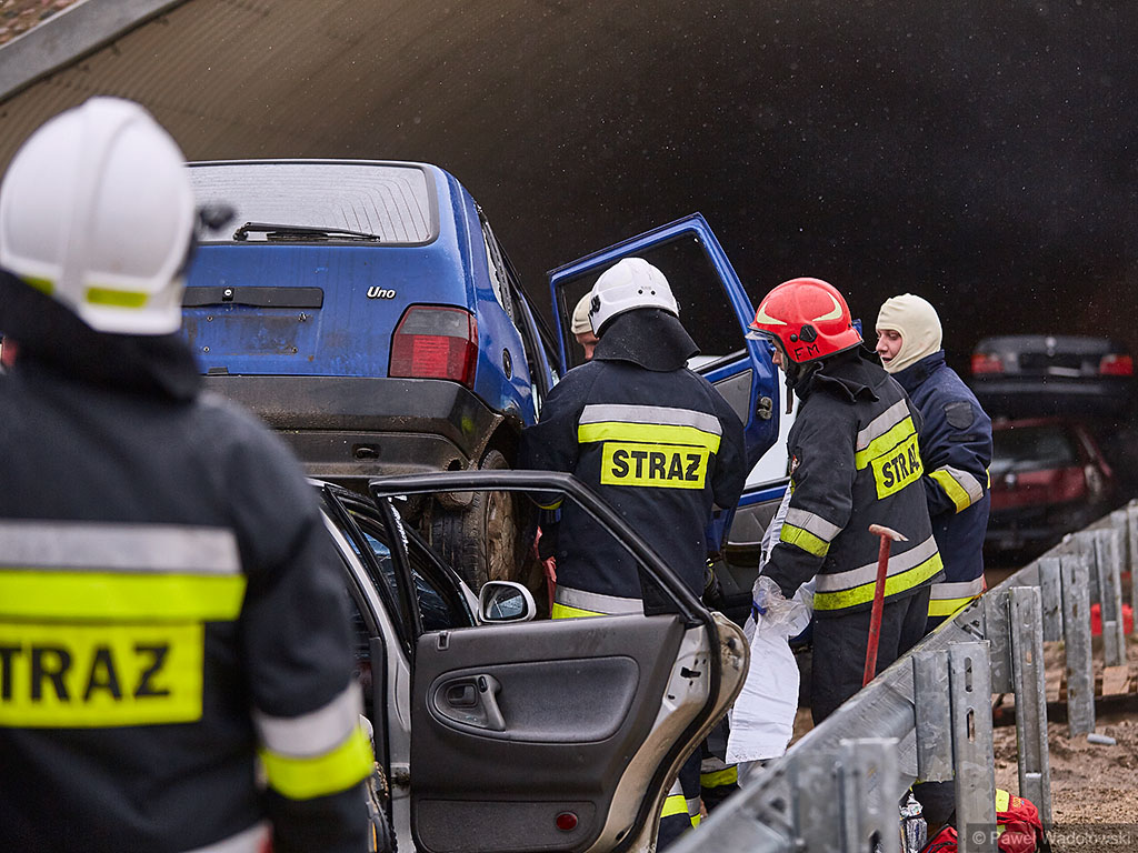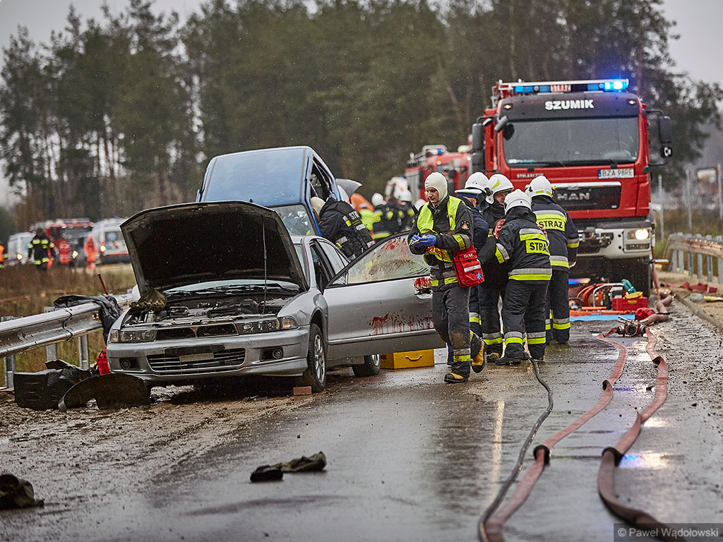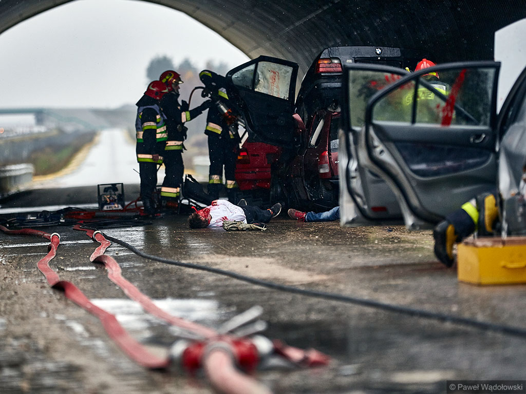 Karambol na drodze ekspresowej, w którym bierze udział 7 samochodów i rannych jest kilkadziesiąt osób - taki scenariusz ćwiczyli w poniedziałek (14.11) podlascy strażacy, policjanci i ratownicy na drodze S8 koło Szumowa.
