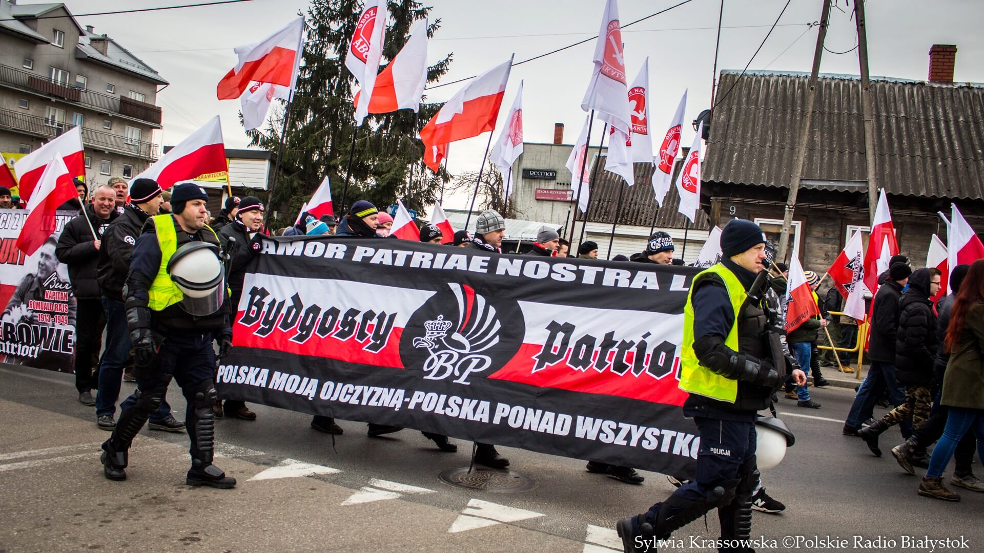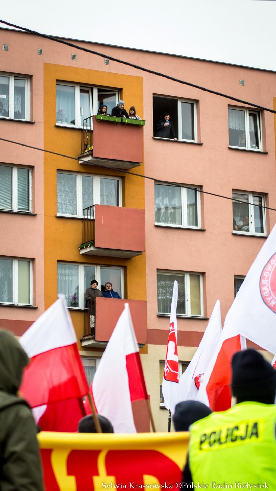 Maszerujący mieli flagi narodowe i ONR, szli pod hasłem "Hajnówka" na biało-czerwonym tle, z przodu widać też było baner z wizerunkami żołnierzy wyklętych i hasłem "Cześć i chwała bohaterom". Wśród haseł było słychać m.in. "To my, to my, Polacy!", "Bóg, honor i ojczyzna!", "Precz z komuną!" ale również "Bury - nasz bohater!".