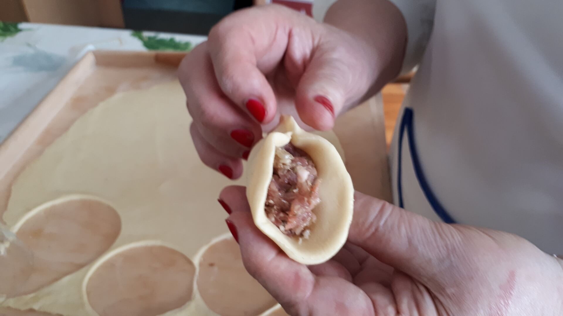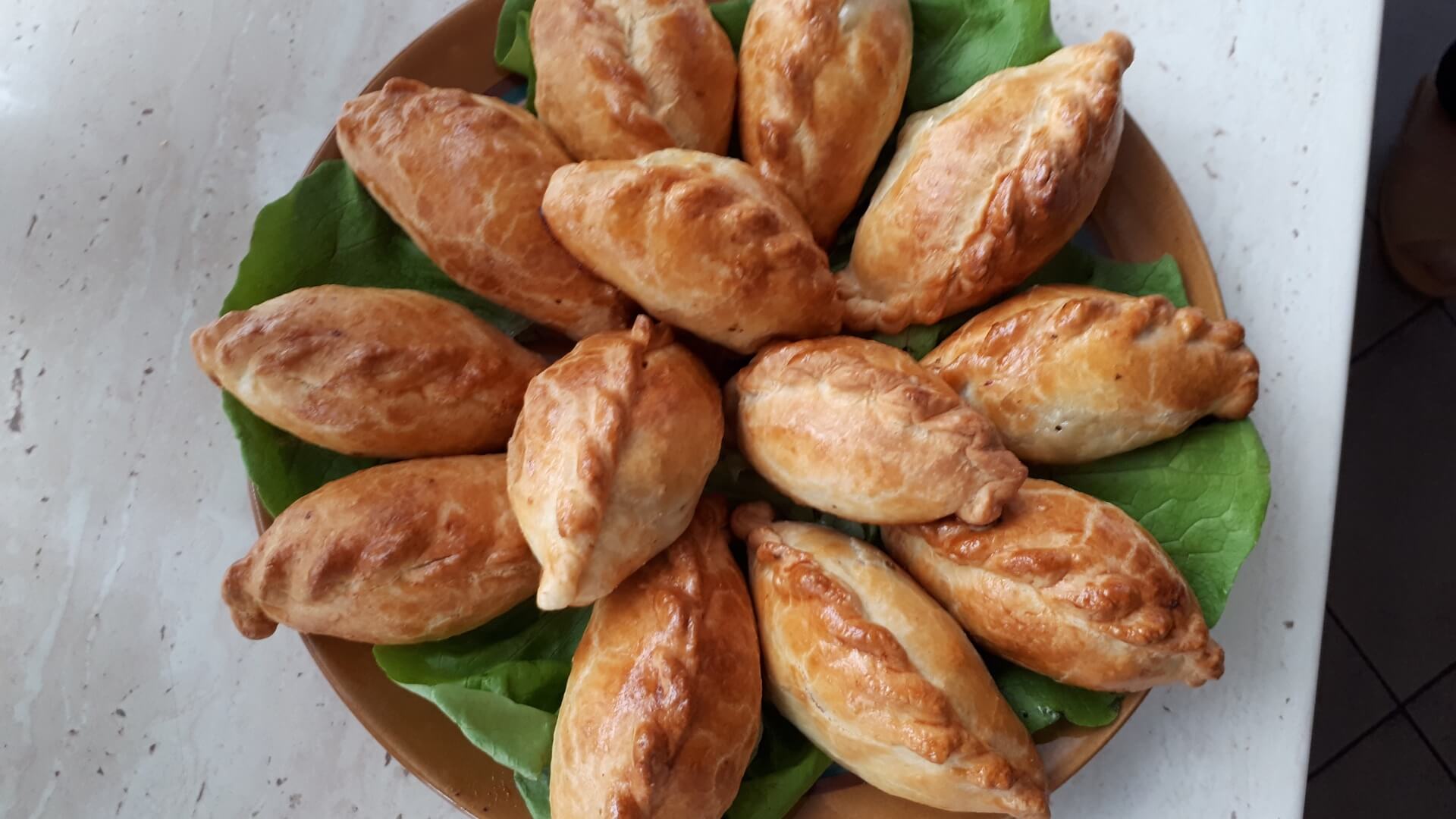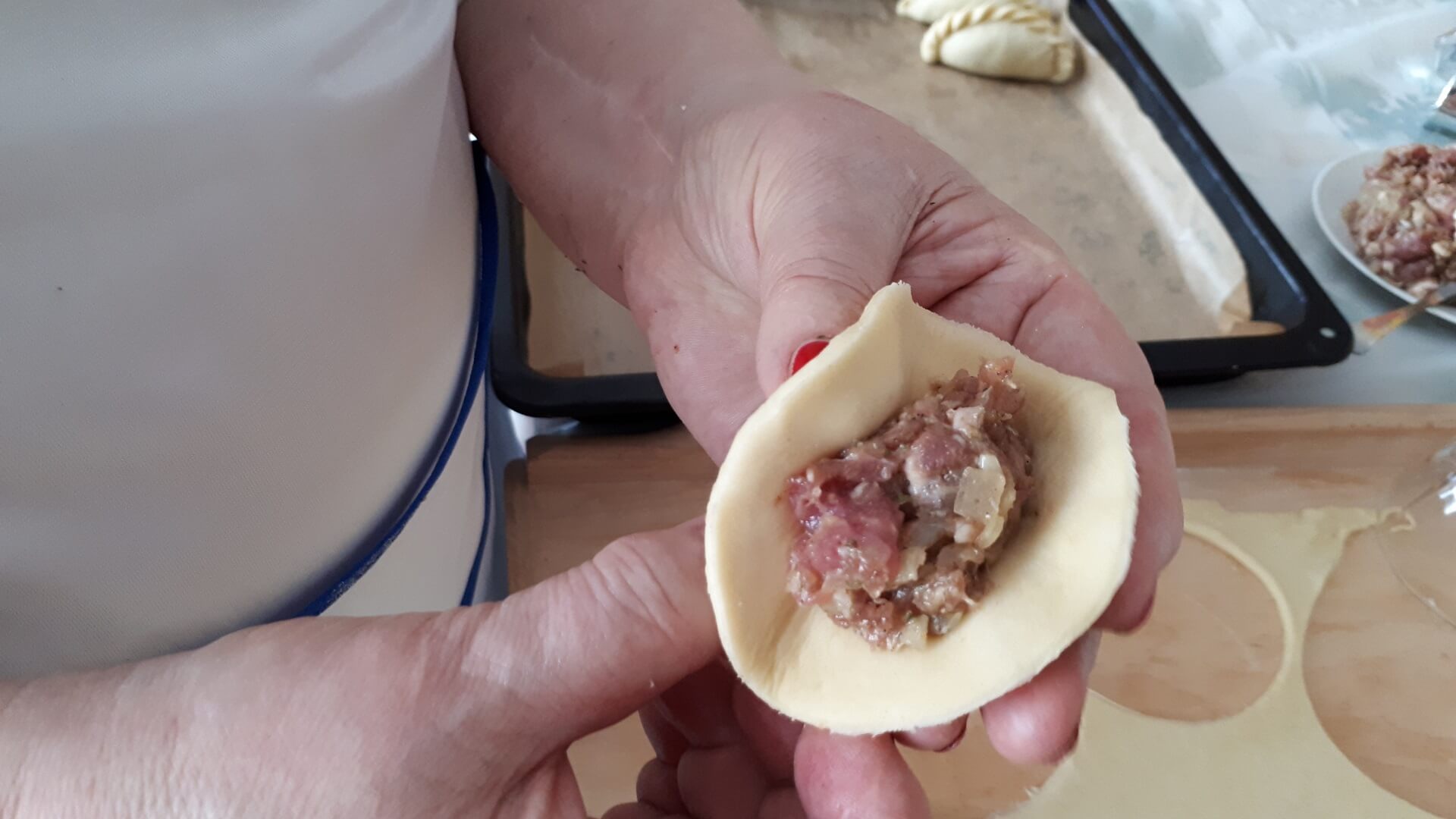 Na stolnicy mąkę siekamy z masłem (temperatura pokojowa, by było miękkie). W śmietanie rozbijamy jajka i dodajemy do ciasta, które odrobinę solimy. Dobrze wyrobione ciasto odstawiamy na kilkanaście minut do lodówki. Potem ciasto rozwałkowujemy jak na makaron, wykrajamy większe krążki (odciskamy na przykład pucharek na lody). Nadziewamy krążki farszem i sklejamy w warkocz. Układamy na blasze wyłożonej papierem do pieczenia. Pierogi ustawiamy warkoczem do góry i obficie smarujemy je roztrzepanym jajkiem. Pieczemy około godziny w 180 stopniach Celsjusza.