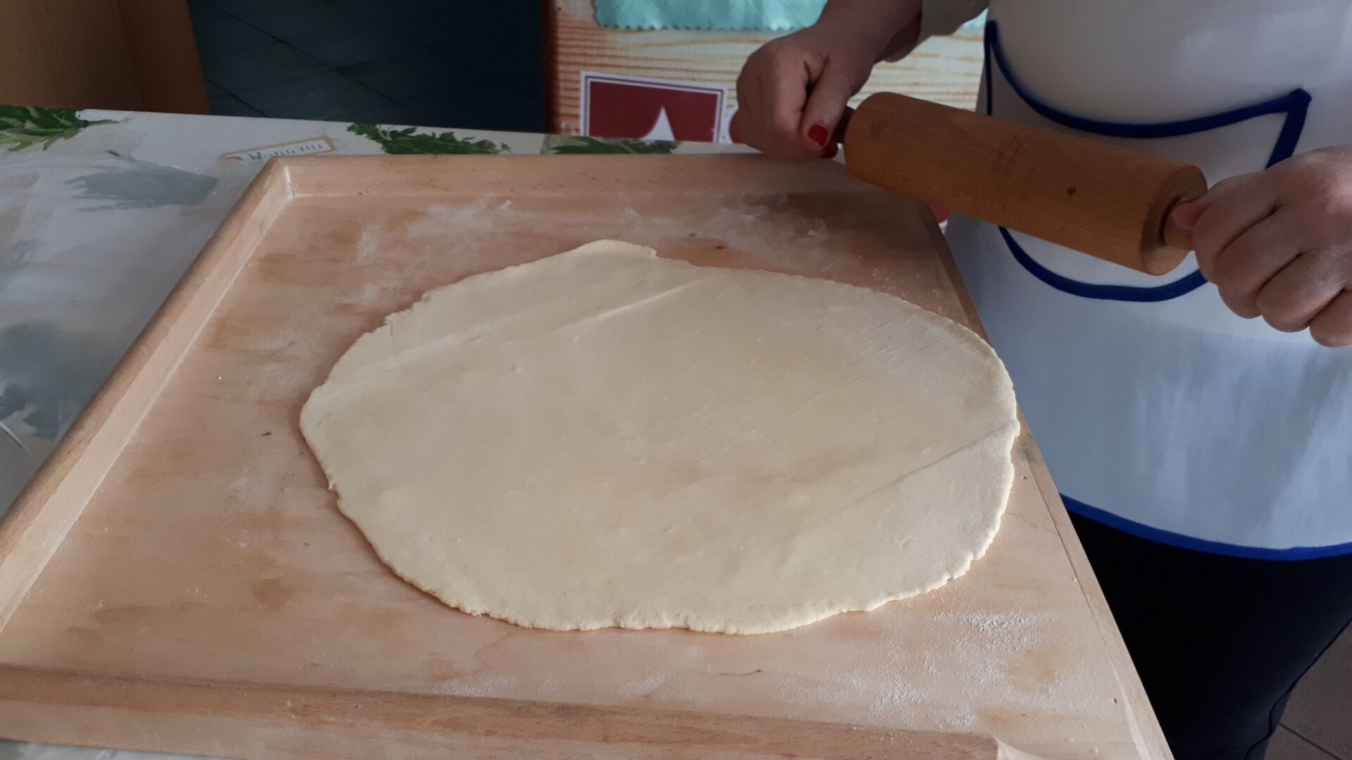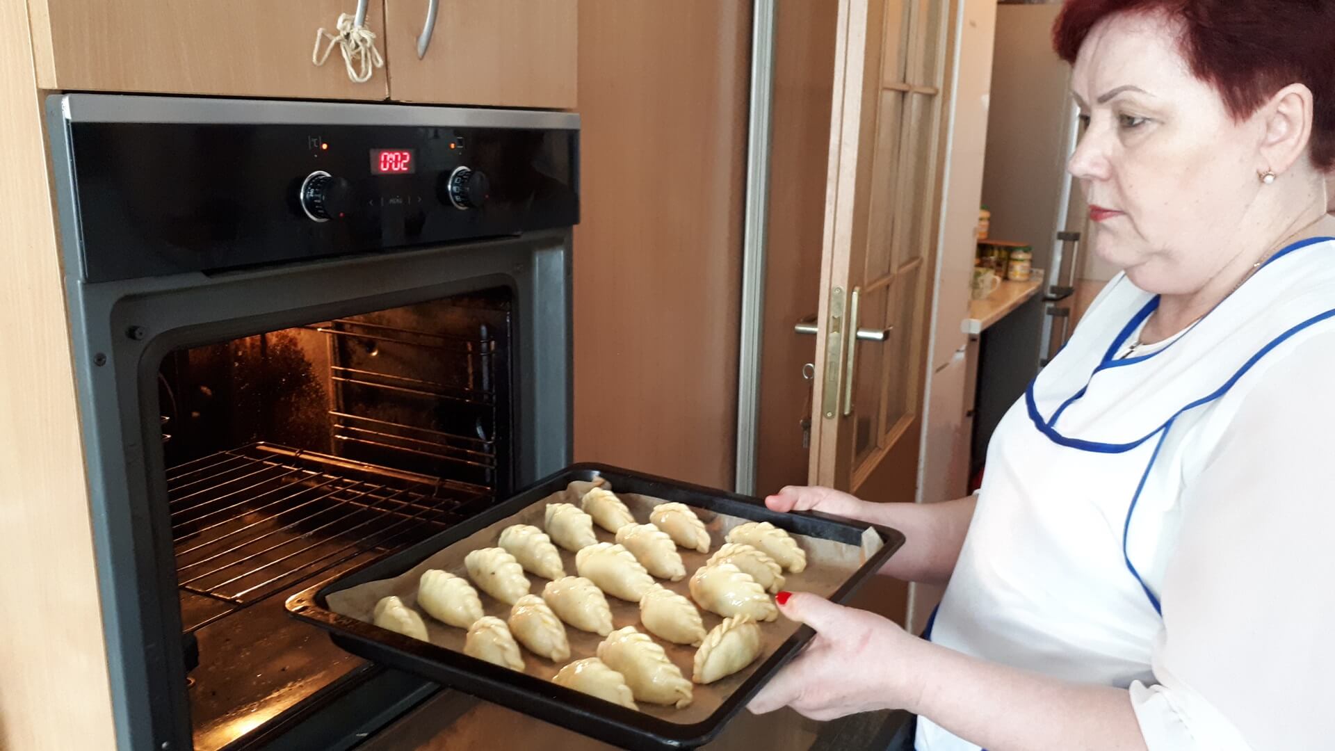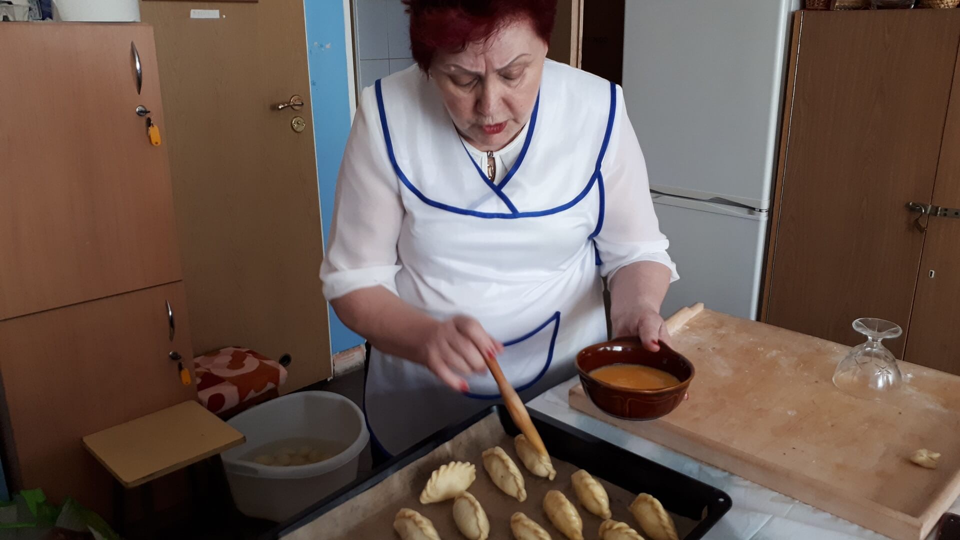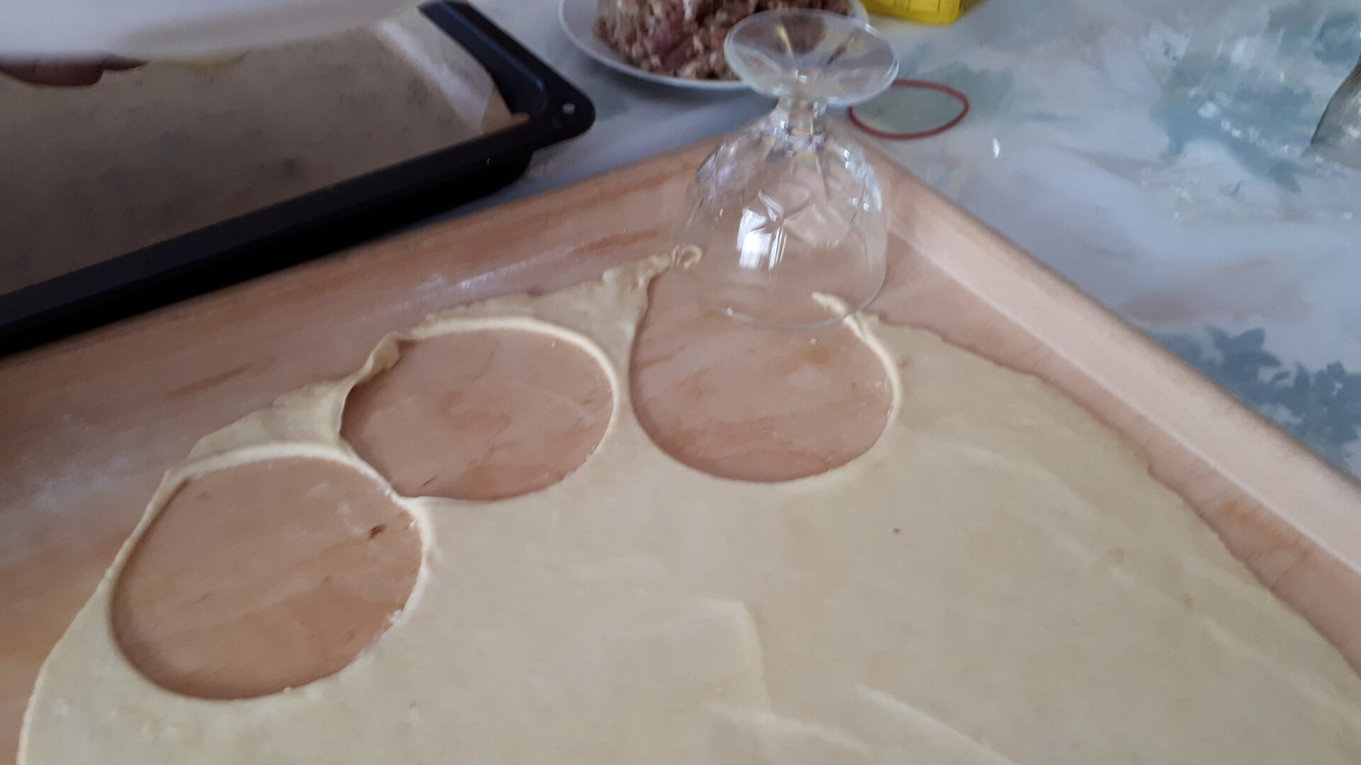 Na stolnicy mąkę siekamy z masłem (temperatura pokojowa, by było miękkie). W śmietanie rozbijamy jajka i dodajemy do ciasta, które odrobinę solimy. Dobrze wyrobione ciasto odstawiamy na kilkanaście minut do lodówki. Potem ciasto rozwałkowujemy jak na makaron, wykrajamy większe krążki (odciskamy na przykład pucharek na lody). Nadziewamy krążki farszem i sklejamy w warkocz. Układamy na blasze wyłożonej papierem do pieczenia. Pierogi ustawiamy warkoczem do góry i obficie smarujemy je roztrzepanym jajkiem. Pieczemy około godziny w 180 stopniach Celsjusza.