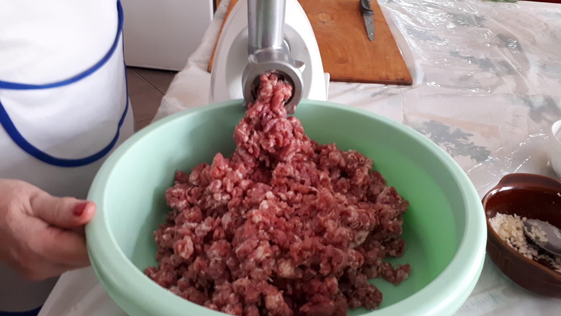 Mięso mielimy przez grube oczka jak na kiełbasę. Siekamy czosnek, który uciskamy z solą i dodajemy do mięsa. Pokrojoną cebulę podsmażamy, dodajemy ją do mięsa po ostudzeniu. Przyprawiamy farsz solą, pieprzem i majerankiem. Dość długo wyrabiamy mięso dodając też ponad szklankę przegotowanej (lub mineralnej) wody. Tak przygotowane mięso odstawiamy na kilkanaście minut do lodówki.