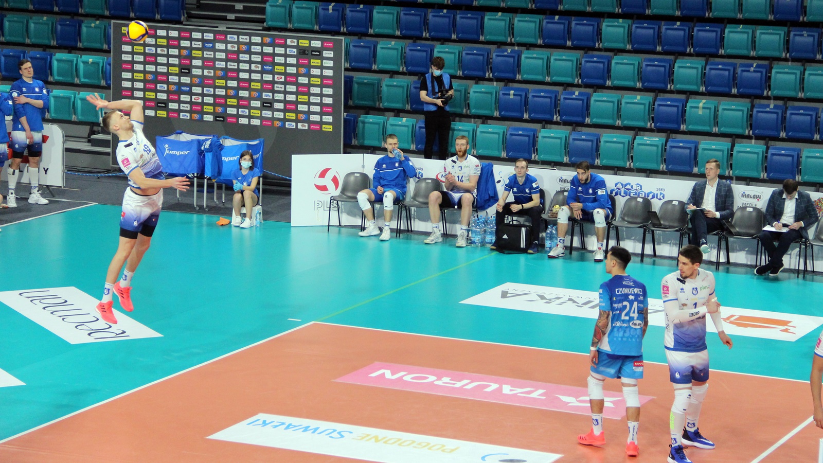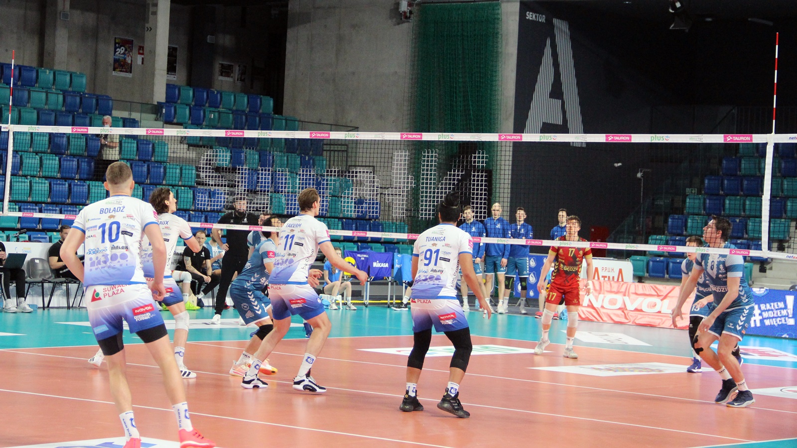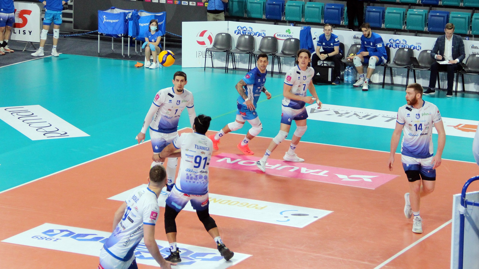 Ślepsk Malow Suwałki wychodzi w składzie: Waliński, Bołądź, Takvam, Rousseaux, Sapiński, Tuaniga i libero Czunkiewicz.