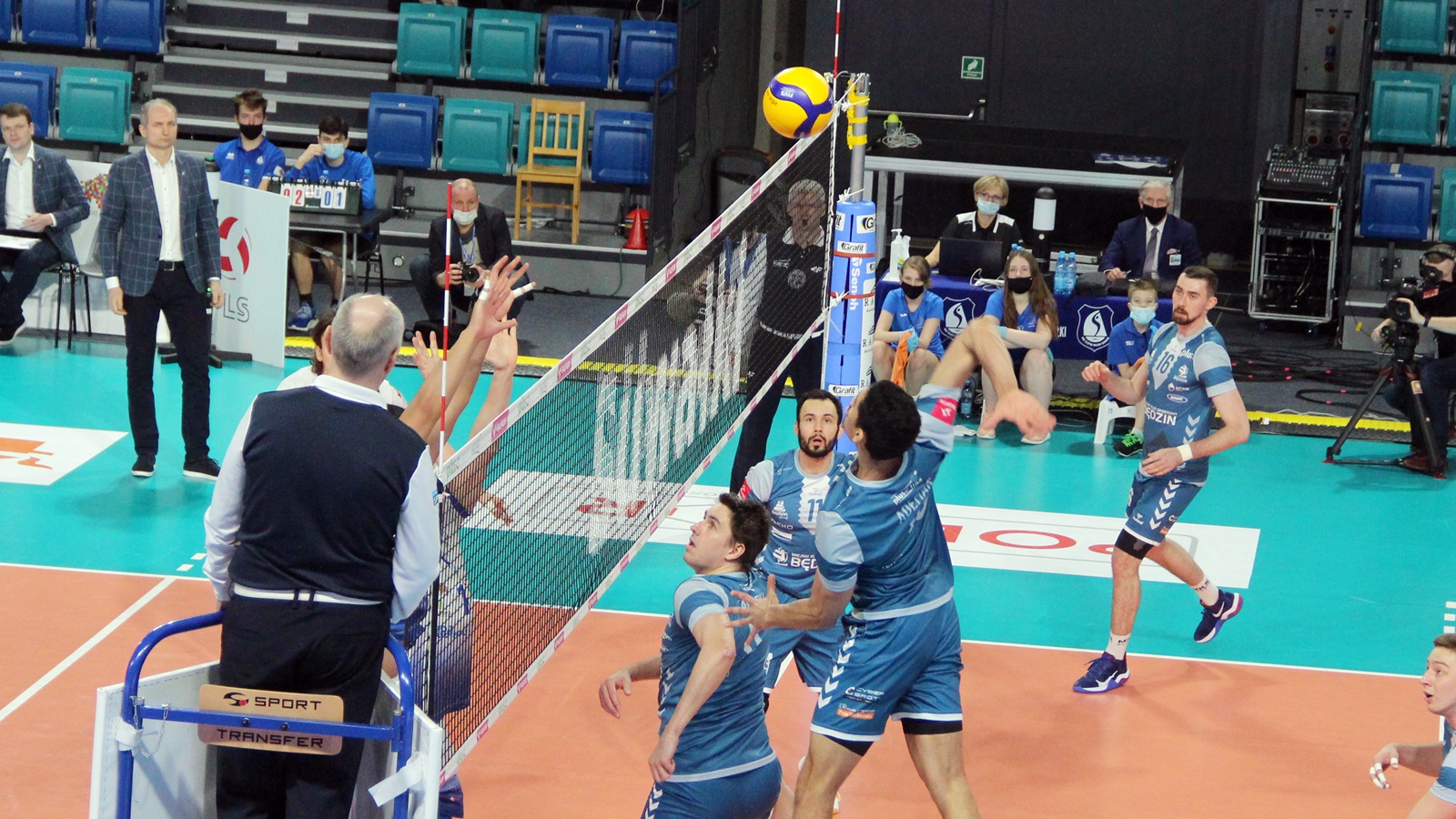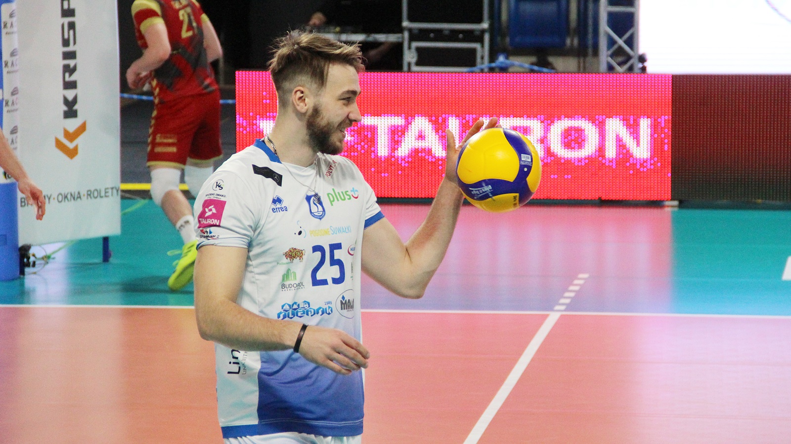 Rafał Faryna zdobywa pierwszy punkt w partii nr dwa. Po jego ataku piłka trafia w głowę Czunkiewicza, za chwilę zagrywkę psuje Ratajczak, a blokiem popisuje się Rousseaux. Zagrywkę psuje Sapiński, to samo robi Faryna, a po nim Bołądź. Na małym prowadzeniu goście - 6:4. Suwalczanie dochodzą ich dopiero przy stanie 15:15. Po kiwce Bołądzia biało-niebiescy wychodzą na prowadzenie 17:16. Asa serwuje Sapiński i jest 19:17. Czas bierze Jakub Bednaruk. Zagrywką trafia tym razem Bołądź i przy 21:18 - drugi czas dla Będzina. Na niewiele się to zdaje, po jednej z dłuższych akcji punkt zdobywa atakujący Ślepska, po czym dokłada kolejnego asa i jeszcze jednego - piłka setowa dla gospodarzy. Pierwszą jeszcze bronią, następnie Santana nie trafia w boisko zza dziewiątego metra i koniec seta - 25:19.