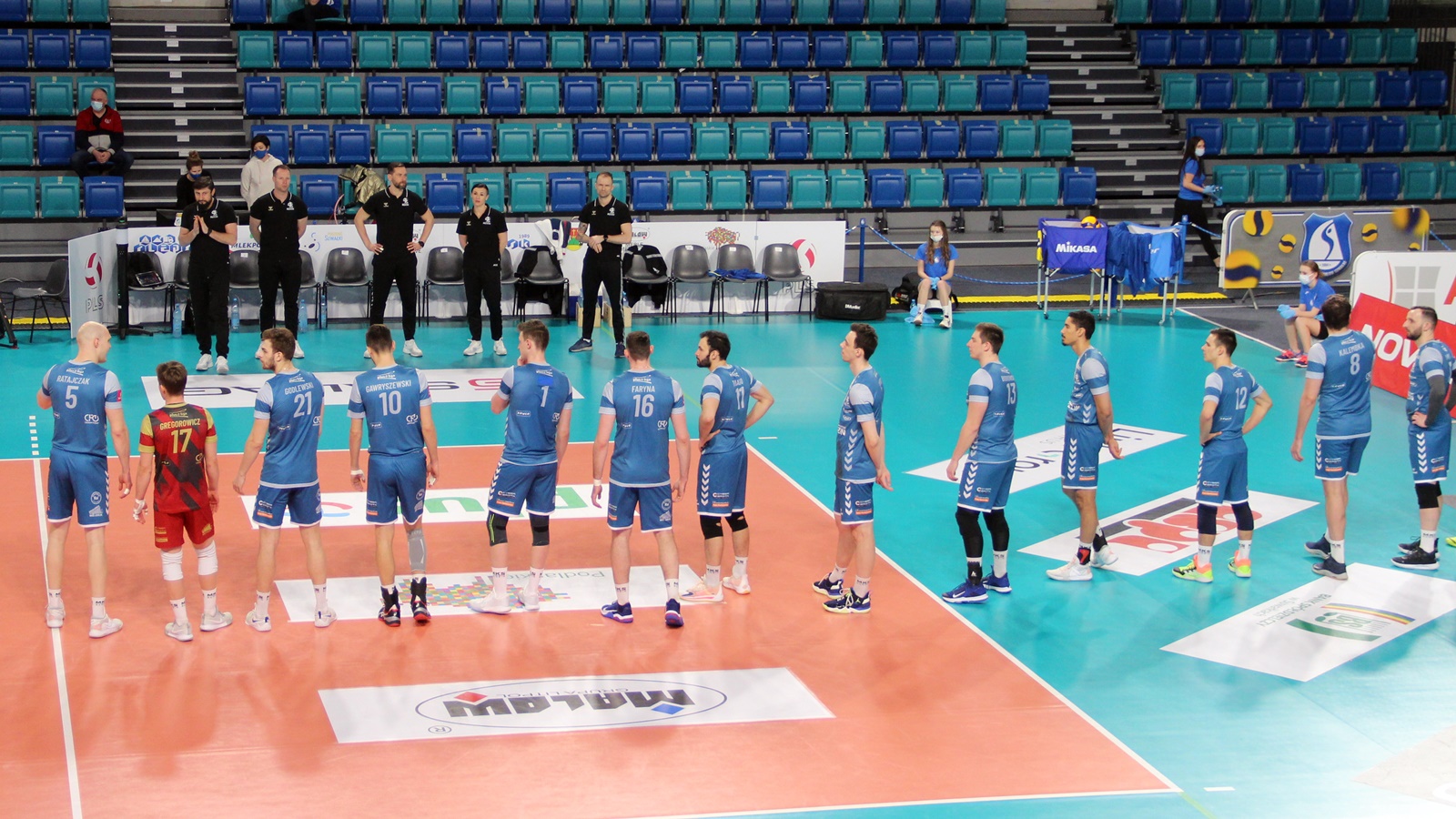 Goście wychodzą następująco: Santana, Bobrowski, Faryna, Gawryszewski, Thiago, Kalembka i libero Gregorowicz.