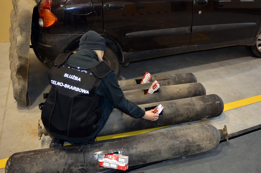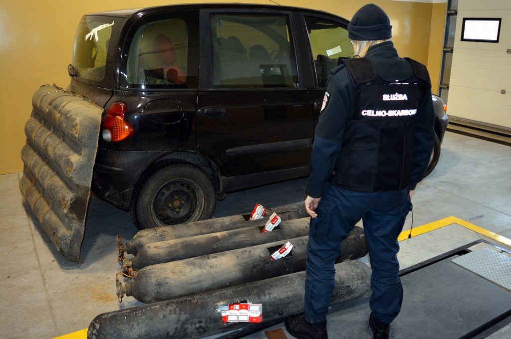 Podczas rewizji poprzedzonej prześwietleniem rentgenowskim pojazdu okazało się, że w samochodzie ukryta jest tytoniowa kontrabanda. Papierosy o szacunkowej wartości rynkowej ponad 17 tys. złotych (1300 paczek) funkcjonariusze znaleźli w podwieszonych pod podwoziem fiata 4 butlach na gaz.