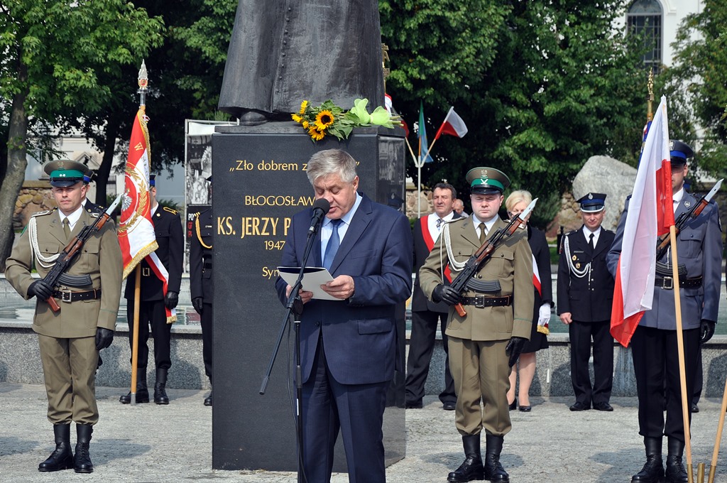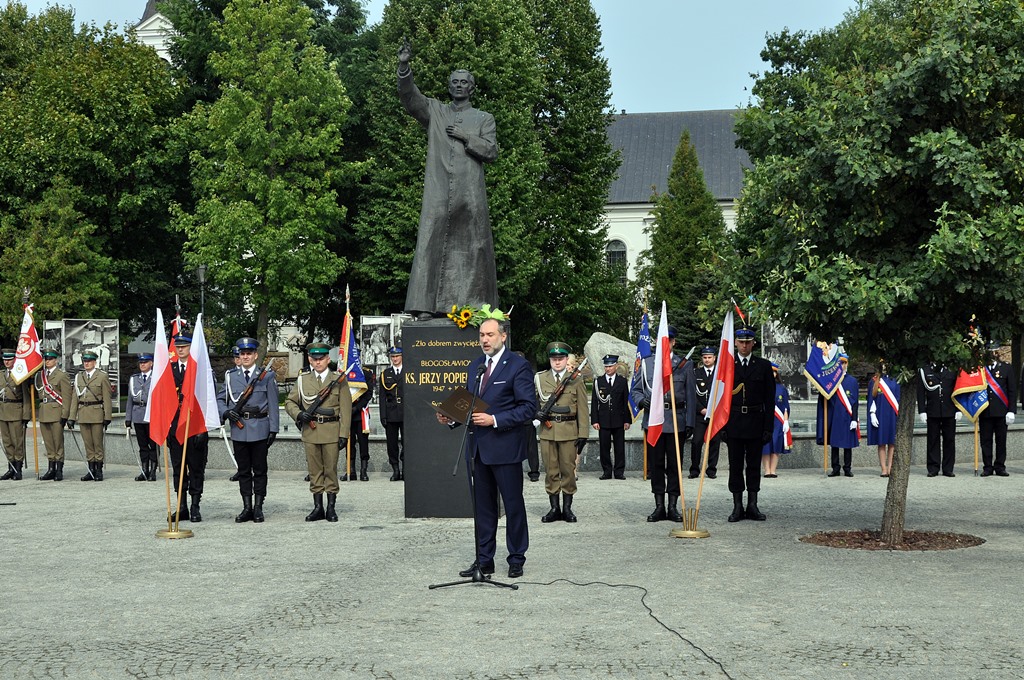 Z pokorą, ale i wdzięcznością dziękujemy dzisiaj panu Bogu za dar jego życia, za dar jego dzieła. Za to, że dzięki niemu dzisiaj jesteśmy wolni, przełamaliśmy, a do tego prowadził nas ksiądz Jerzy Popiełuszko, totalitaryzm, przełamaliśmy zniewolenie, komunizm. Odzyskaliśmy niepodległość, suwerenność. Pokonaliśmy pod jego przewodnictwem znaczną część zła, bo pamiętamy jego najważniejsze słowa - "zło dobrem zwyciężaj" - mówił podczas uroczystości Jarosław Zieliński.