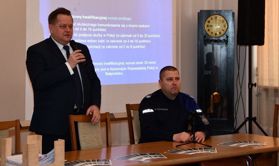 Kilkudziesięciu kandydatów do służby wzięło udział w spotkaniu w Komendzie Wojewódzkiej Policji w Białymstoku z udziałem wiceministra spraw wewnętrznych i administracji Jarosława Zielińskiego. Przyszli funkcjonariusze wywodzą się z różnych środowisk, ale - jak mówią - o tej pracy marzyli od dawna.