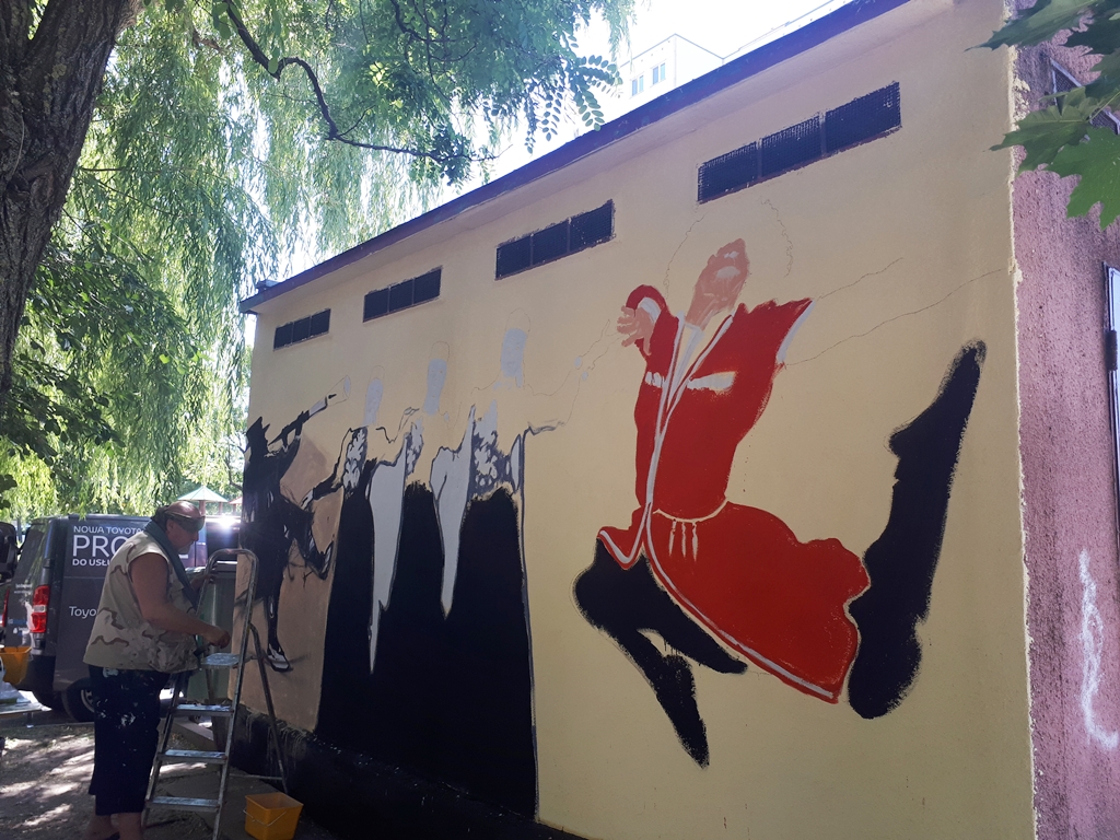 Mural przedstawia czeczeńskiego tancerza, krymskie tatarki i Polaka grającego na dudach. Pracę można zobaczyć na ścianie transformatora przy ul. Radzymińskiej w Białymstoku.