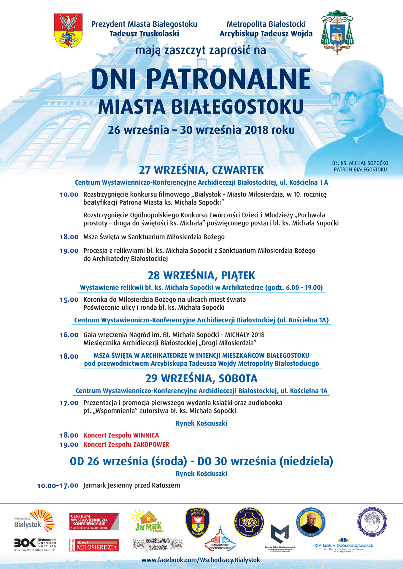 Uroczyste msze, jarmark, nadanie imienia nowowybudowanej ulicy, konkursy, promocja książki i audiobooka, a także koncert - to program tegorocznych Dni Patronalnych w Białymstoku.