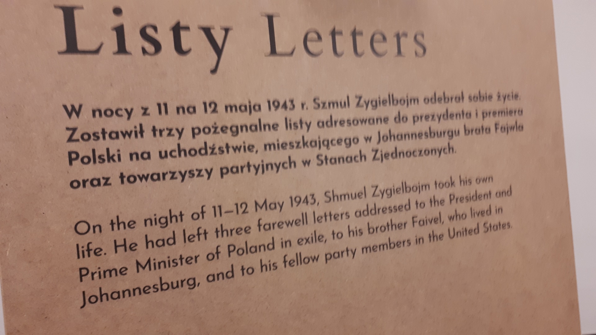 Szmul Zygielbojm odebrał sobie życie, w geście protestu wobec zagłady żydów z warszawskiego getta. Wcześniej wysłał trzy listy, między innymi do prezydenta RP, w których informował, że jest to jego forma protestu.