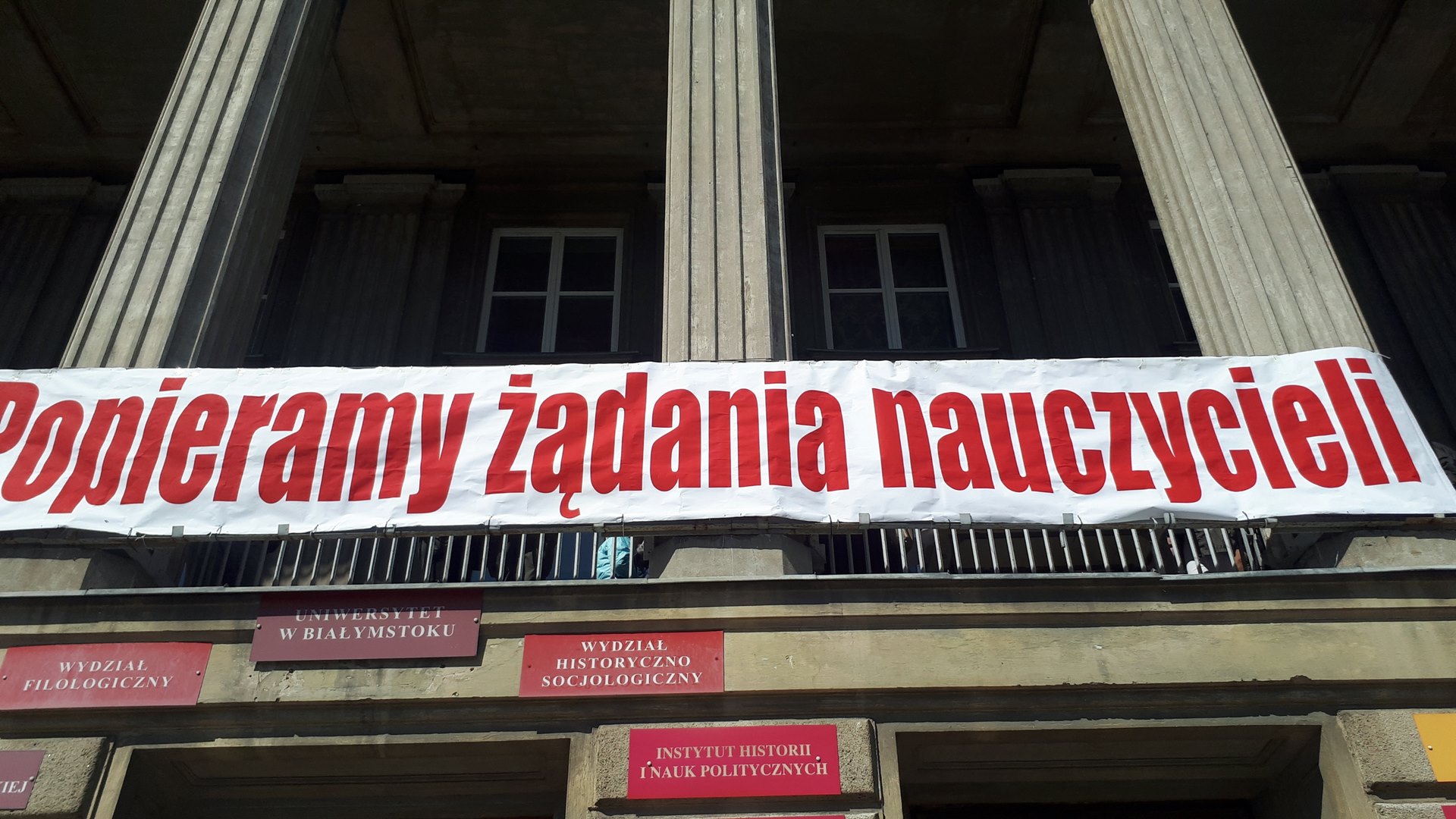 Wiec popierający strajkujących nauczycieli odbył się na balkonie budynku tzw. Domu Partii, gdzie swoje siedziby mają Wydziały Filologiczny i Historyczno-Socjologiczny Uniwersytetu w Białymstoku (UwB). Od początku protestu na balkonie wisi baner: "Popieramy żądania nauczycieli".