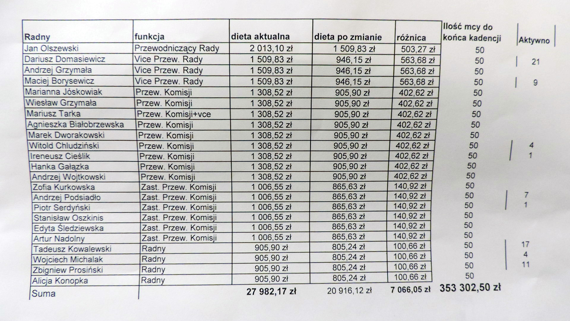 Jest wśród nich przewodniczący rady i jeden z trzech wiceprzewodniczących. To oni według projektu maja stracić najwięcej - odpowiednio ponad 500 i ponad 560 złotych miesięcznie.