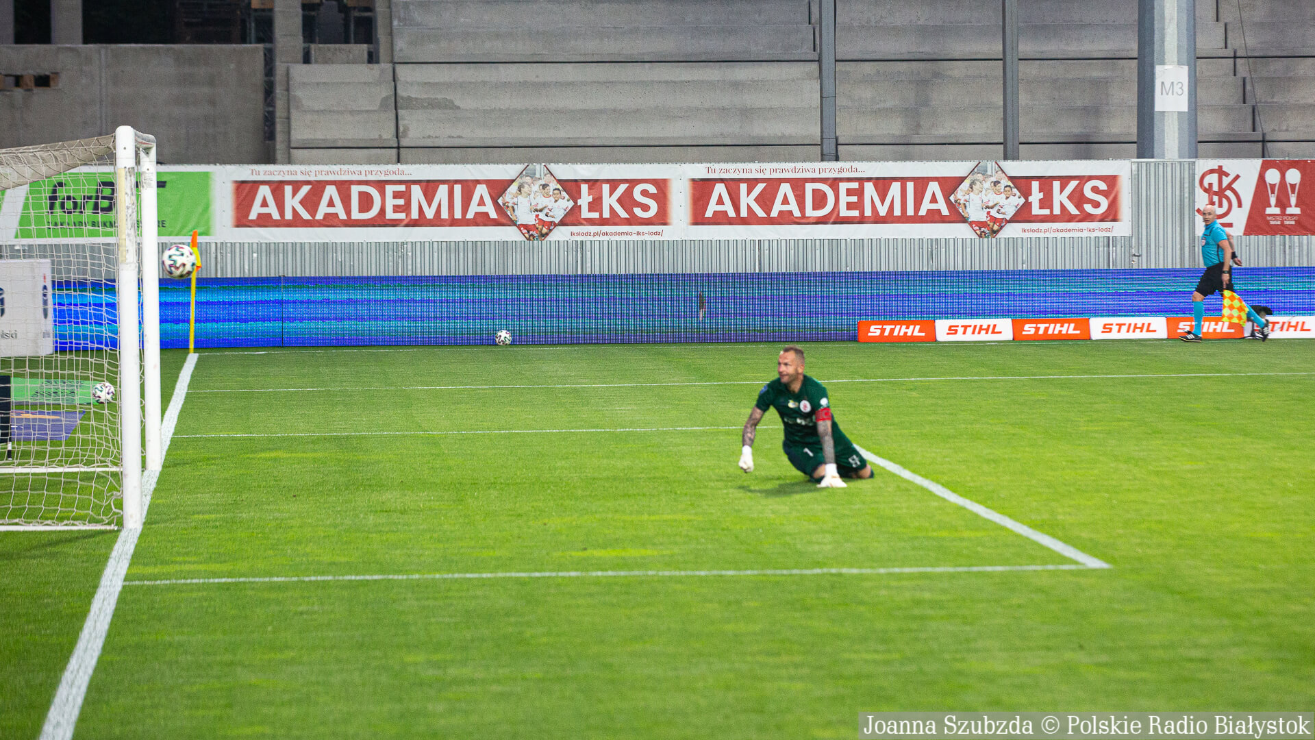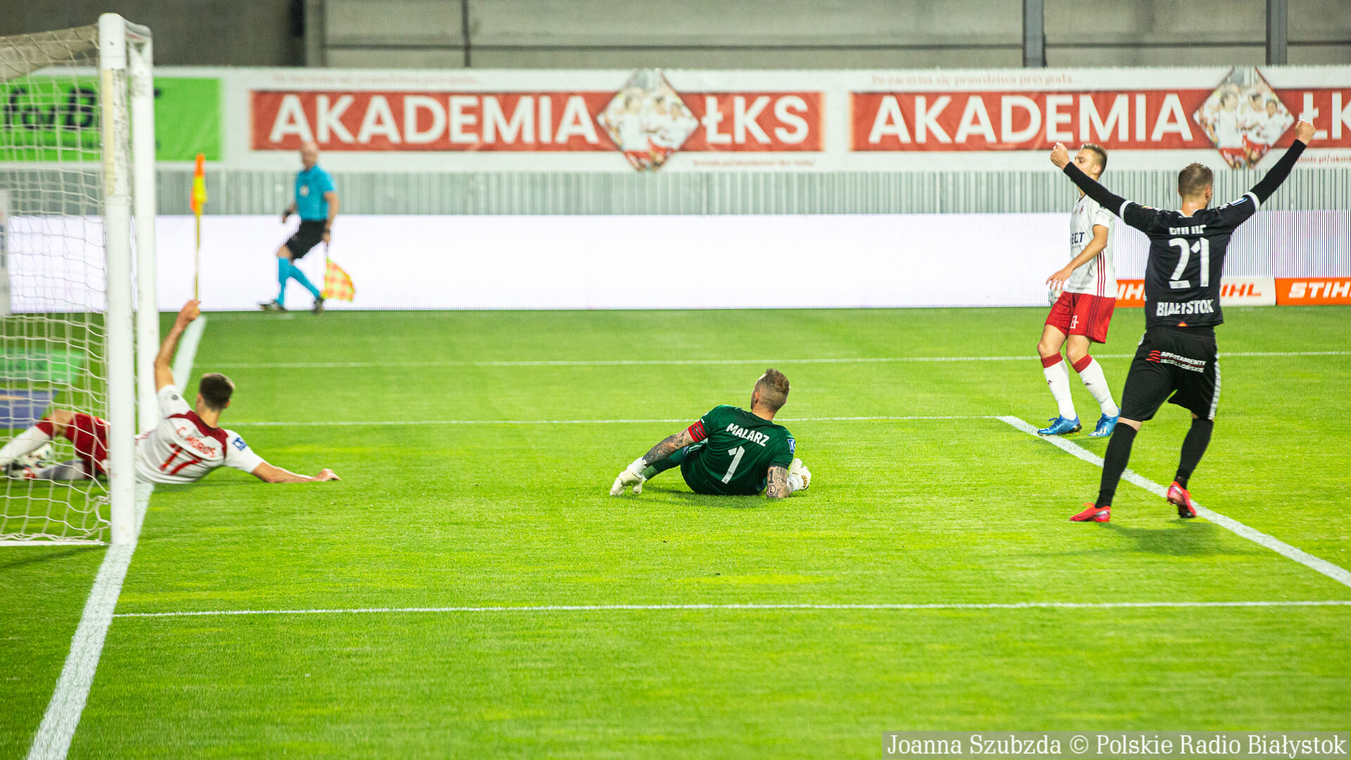 Pomocnik "Jagi" trafił w słupek, ale odbita piłka uderzyła w plecy leżącego na murawie po interwencji Malarza i wpadła do siatki.