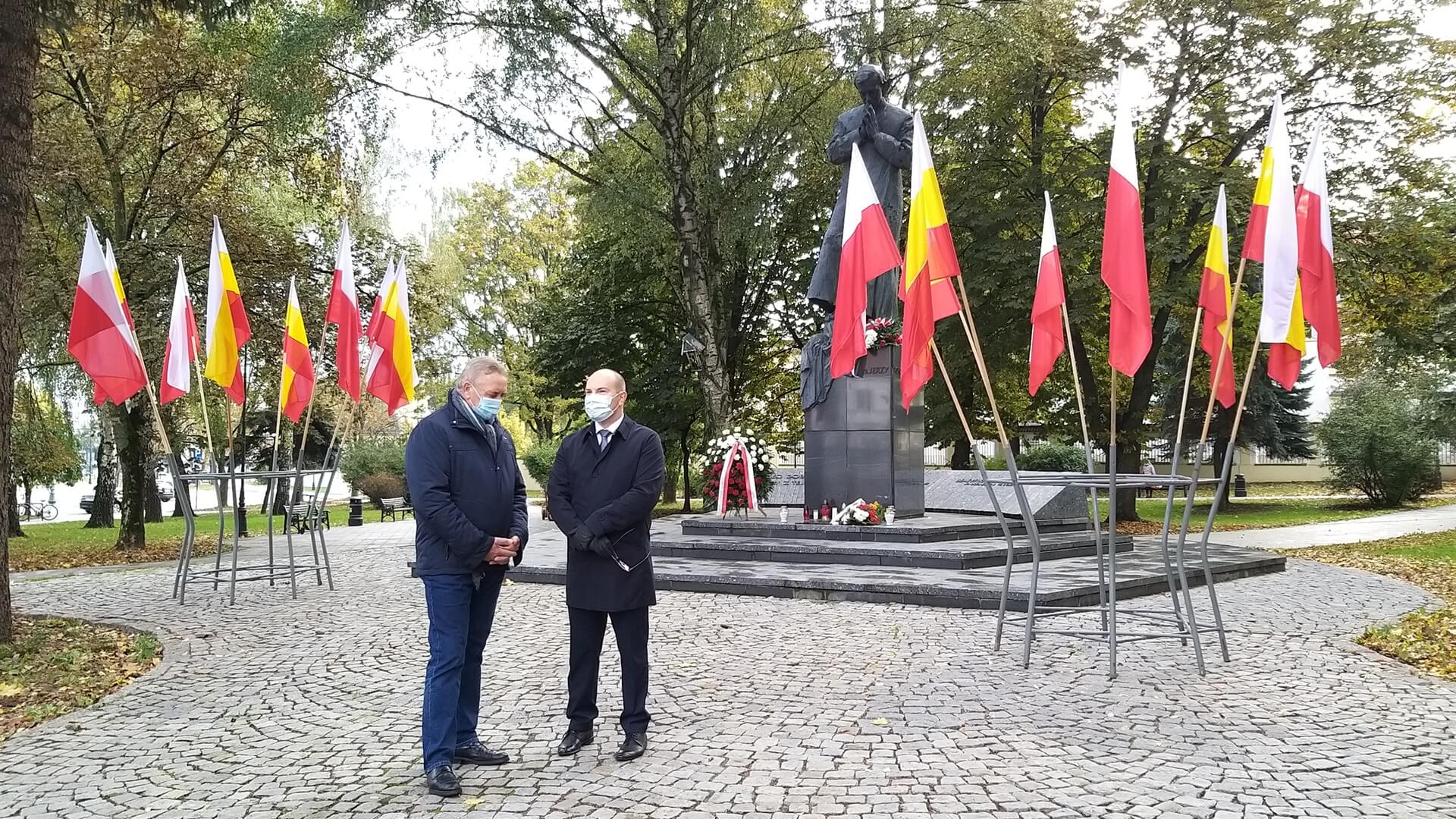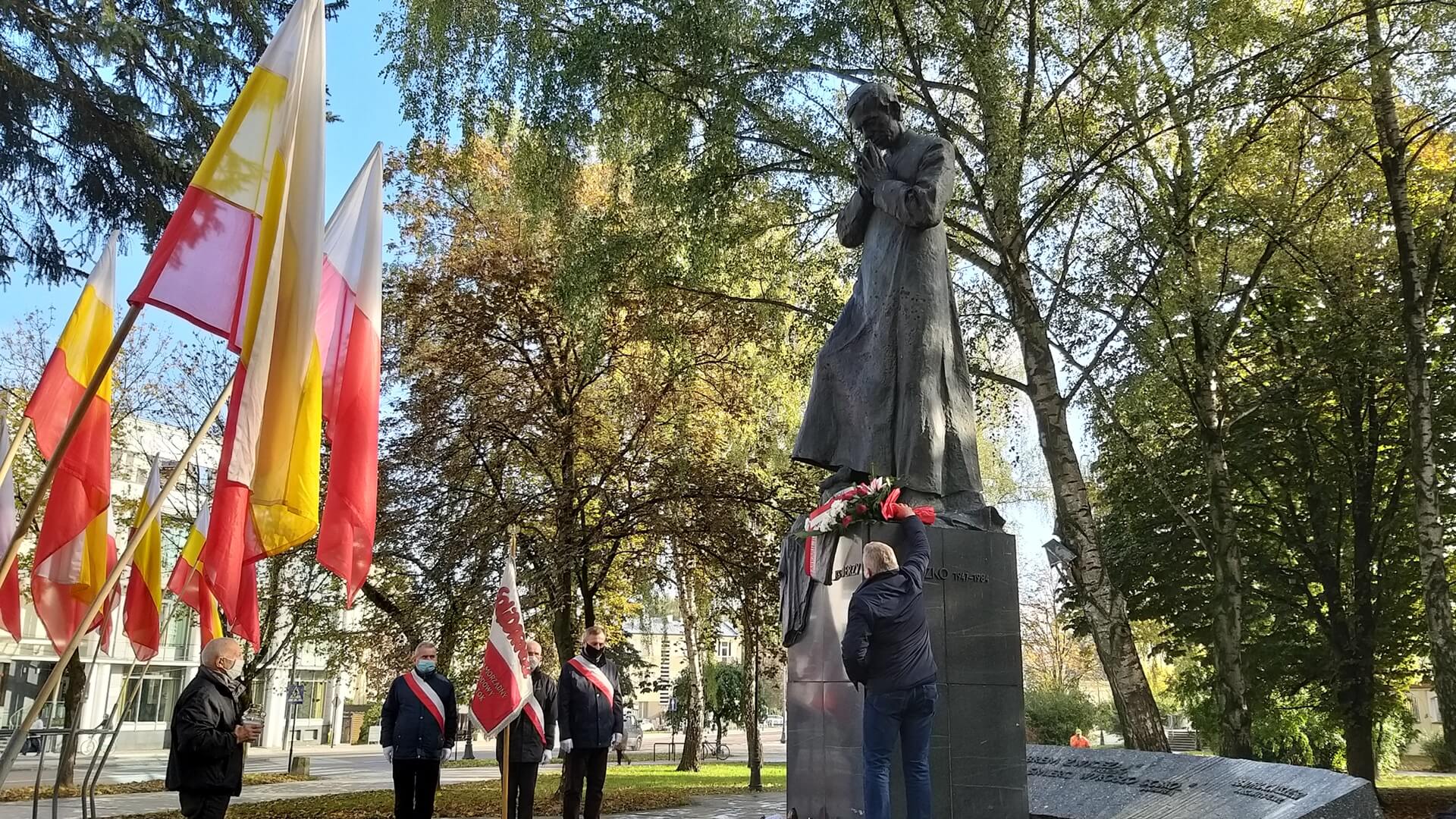 Przed pomnikiem kapłana w Białymstoku kwiaty złożyli m.in. marszałek województwa podlaskiego Artur Kosicki i przewodniczący Zarządu Regionu Podlaskiego NSZZ “Solidarność” Józef Mozolewski. Przy tym symbolicznym miejscu upamiętnienia błogosławionego zatrzymują się też zwyczajni mieszkańcy Białegostoku.