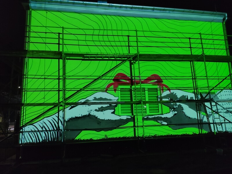 Podopieczni Miejskiego Ośrodka Pomocy Społecznej w Mońkach pod okiem artysty - grafika Wiktora Klimaszewskiego malują mural. To metafora pomocy: prezent podawany z rąk do rąk. I nie chodzi tu tylko o pomoc materialną, ale też o integrację.