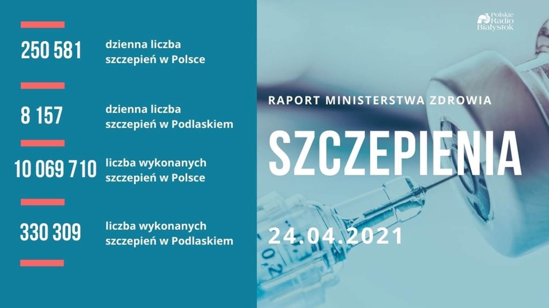 W Polsce w pełni zaszczepionych - czyli dwiema dawkami lub jednodawkową szczepionką Johnson & Johnson - jest 2 543 112 osób. Do tej pory wykonano w sumie 10 069 710 szczepień przeciw COVID-19. Pierwszą dawkę otrzymało 7 526 598 osób – podano w sobotę (24.04) na stronach rządowych.