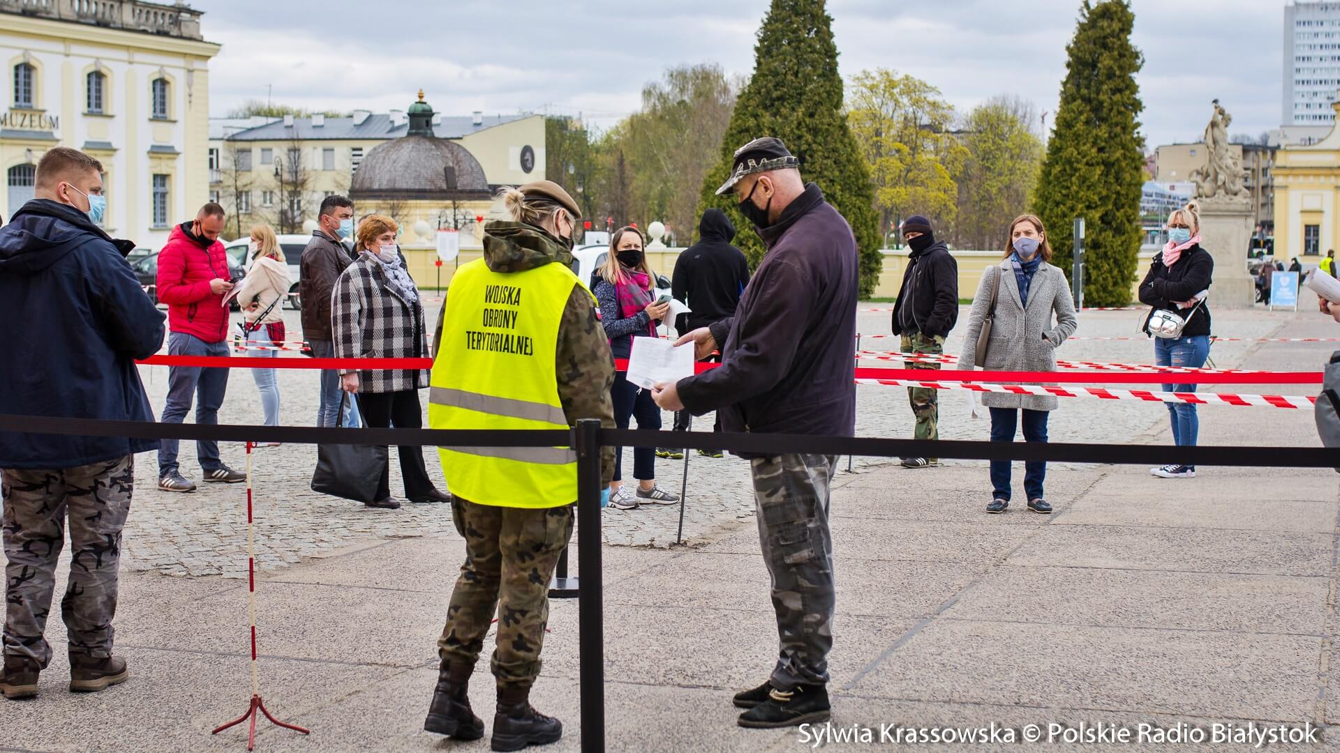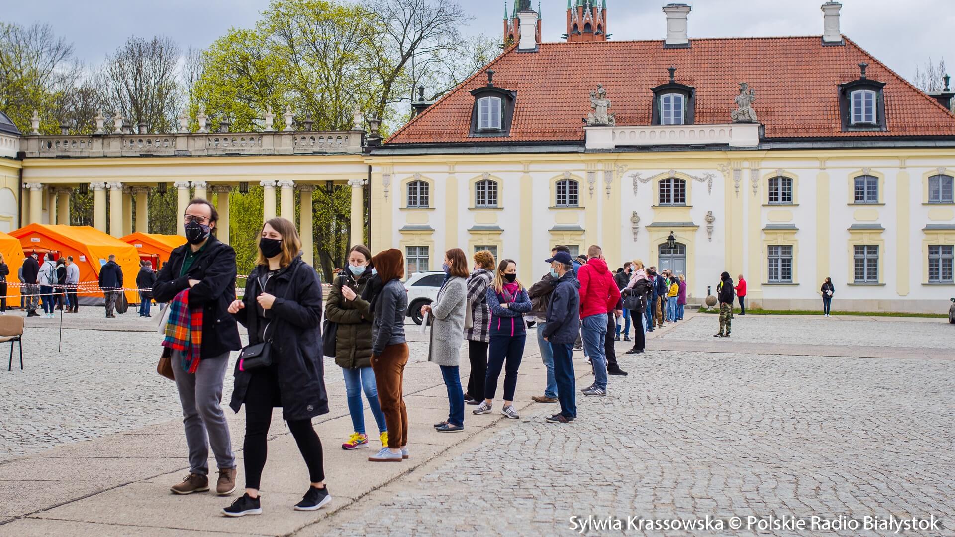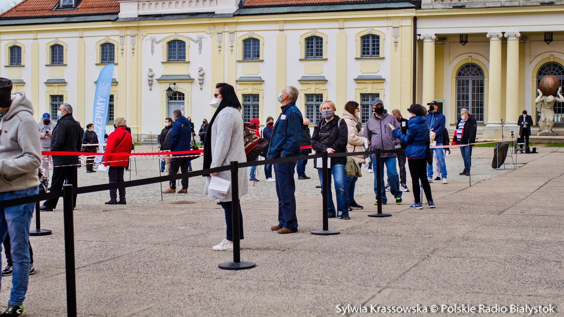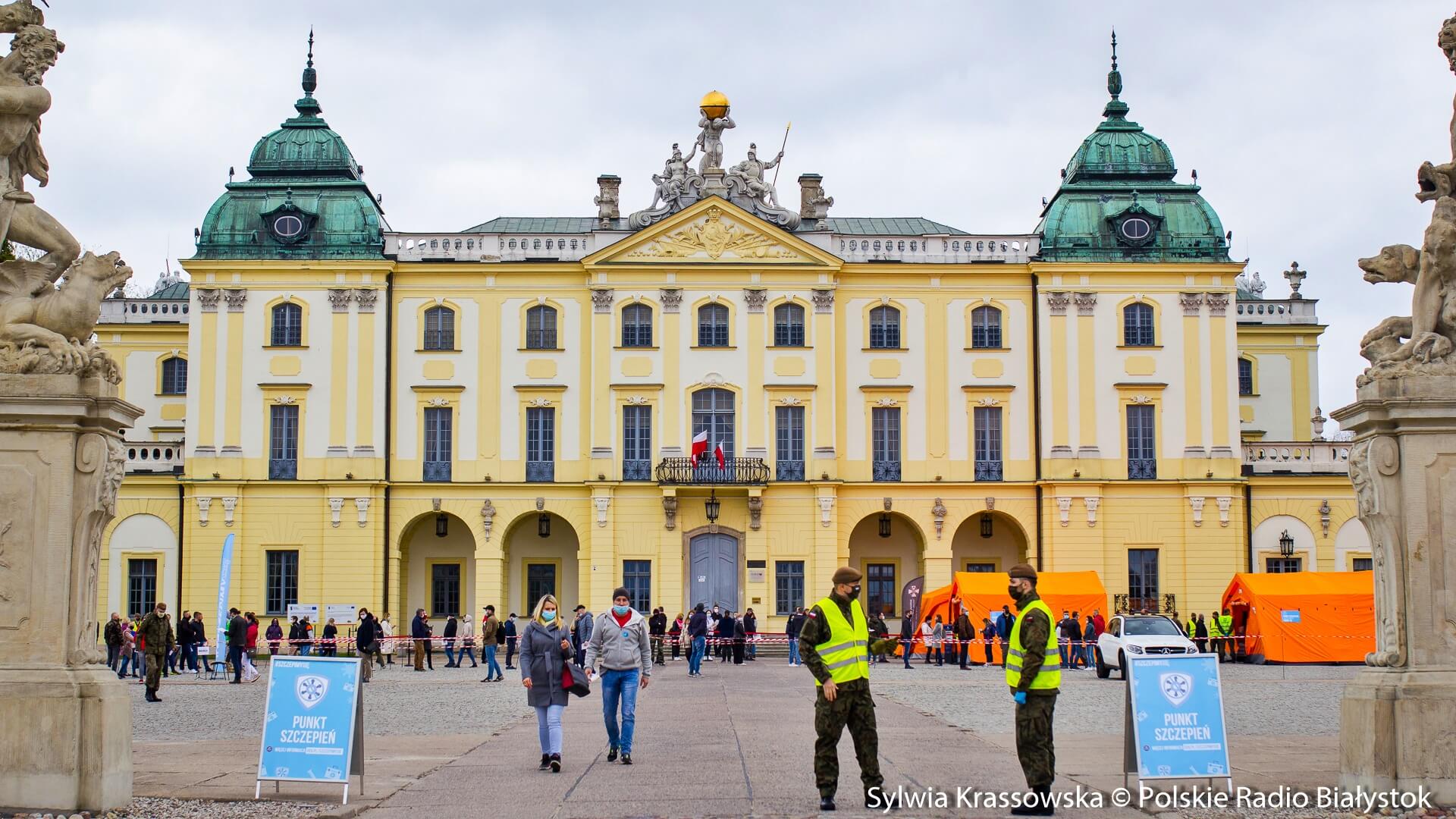 Kolejka chętnych w punkcie zlokalizowanym na dziedzińcu Pałacu Branickich w Białymstoku ustawiła się jeszcze przed godz. 10:00, dlatego pierwsze szczepienia rozpoczęto nieco wcześniej, niż planowano. W sumie pracują tam trzy zespoły (lekarz plus pielęgniarka) i rejestratorka, medykom z Uniwersyteckiego Szpitala Klinicznego (USK) w Białymstoku pomagają żołnierze WOT.