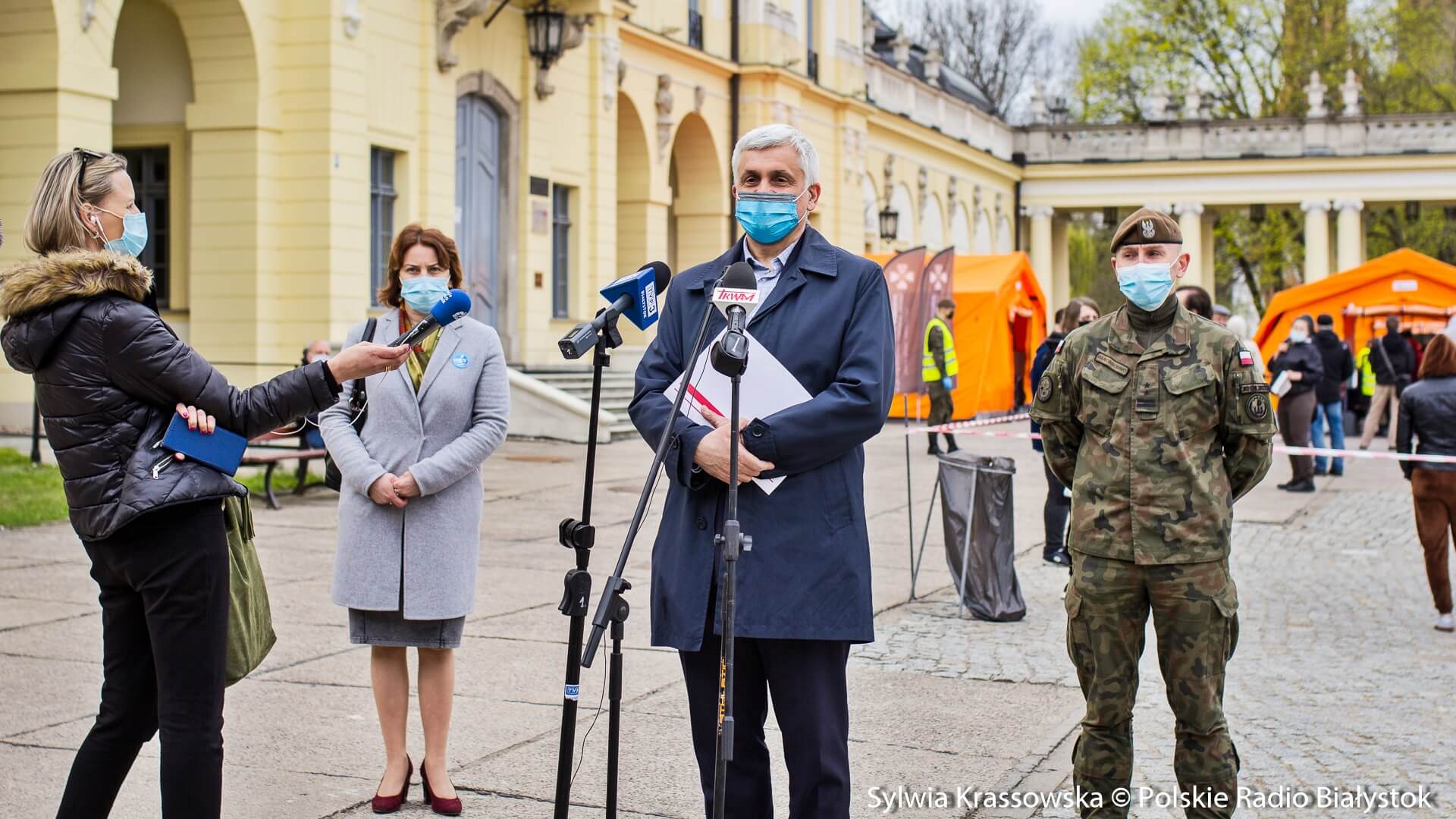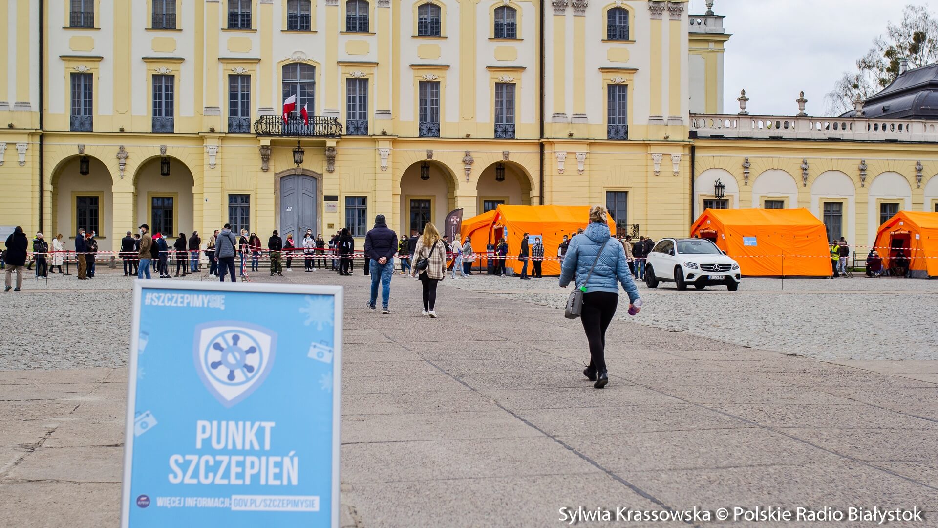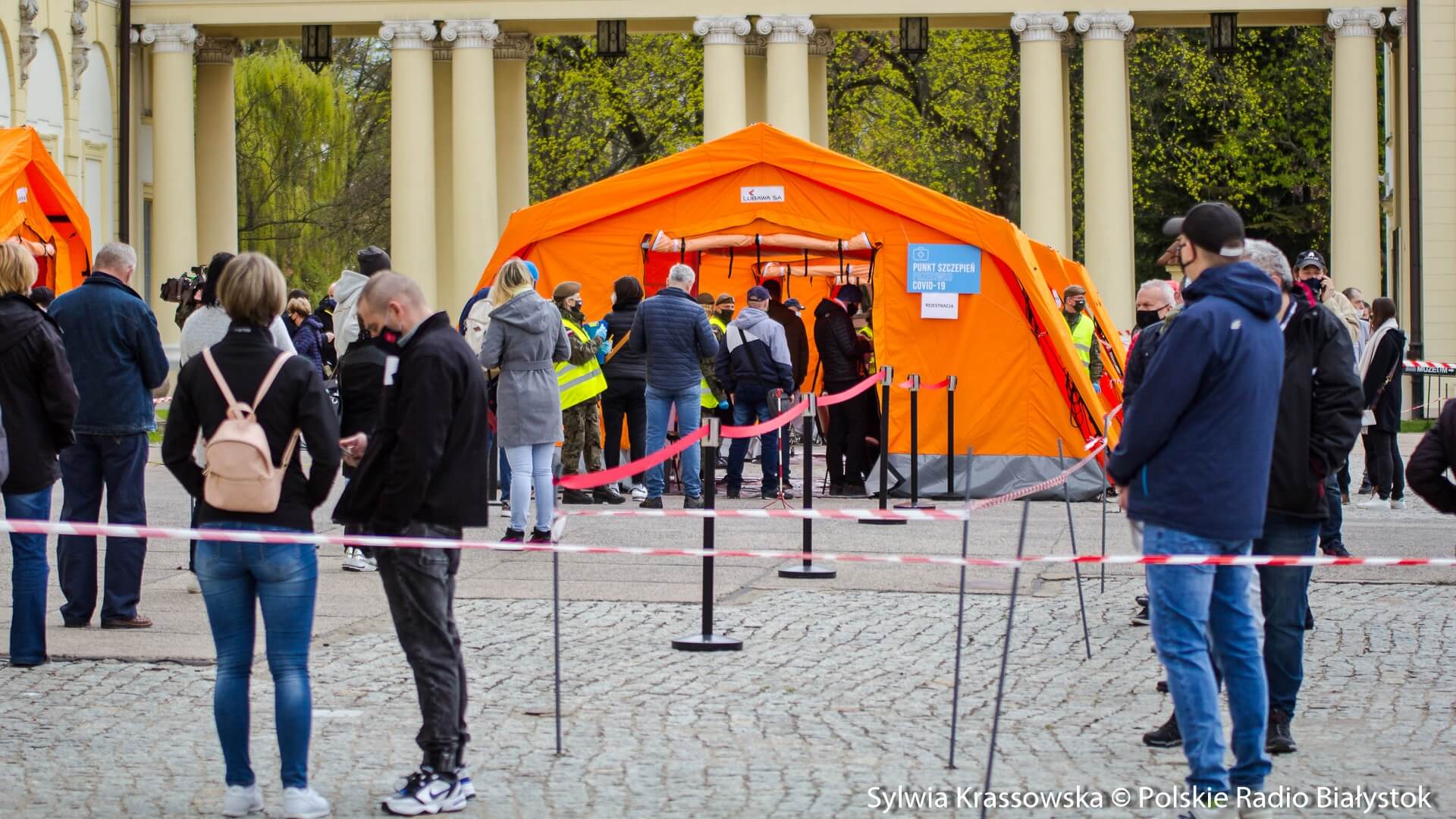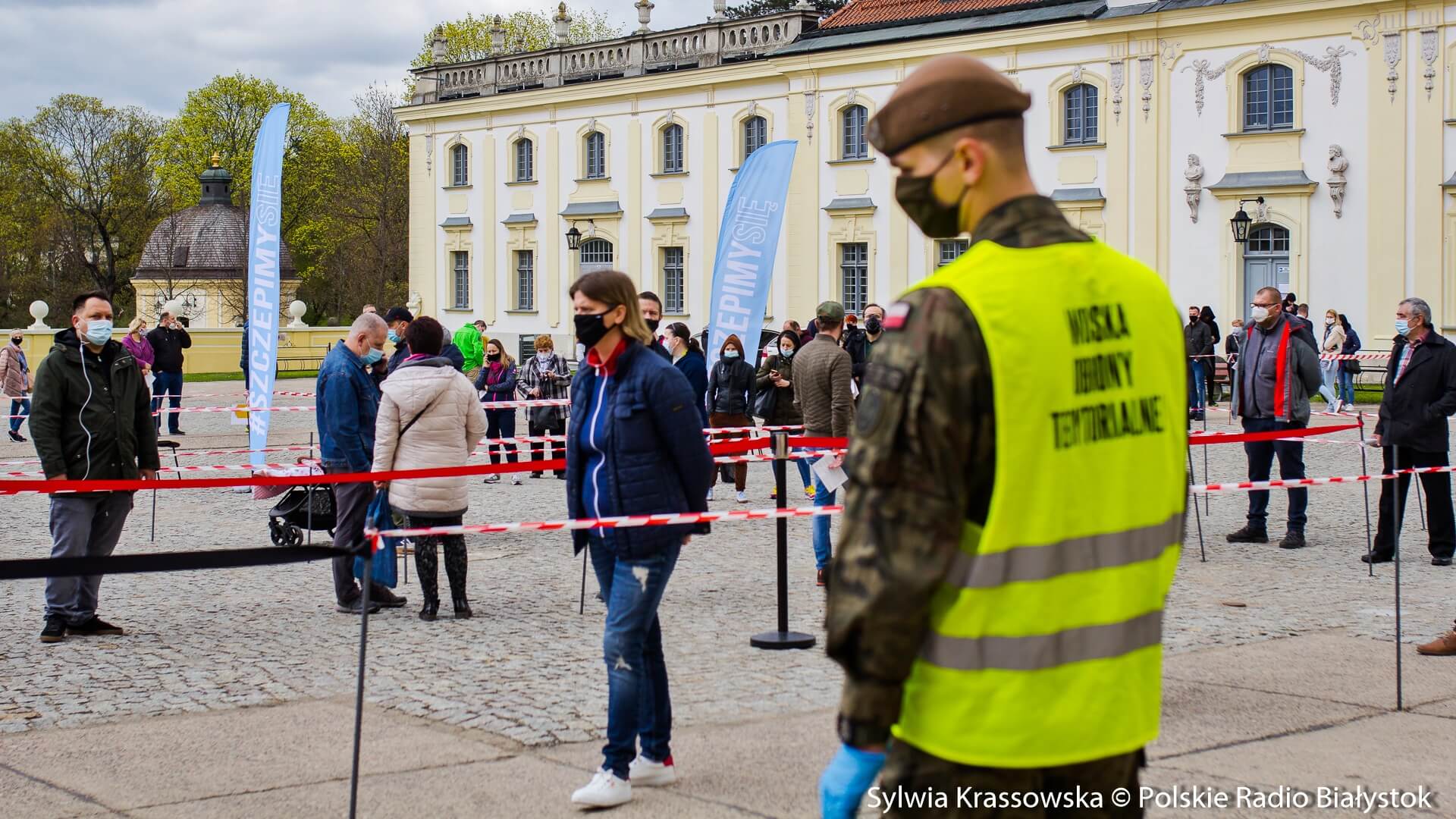 Kolejka chętnych w punkcie zlokalizowanym na dziedzińcu Pałacu Branickich w Białymstoku ustawiła się jeszcze przed godz. 10:00, dlatego pierwsze szczepienia rozpoczęto nieco wcześniej, niż planowano. W sumie pracują tam trzy zespoły (lekarz plus pielęgniarka) i rejestratorka, medykom z Uniwersyteckiego Szpitala Klinicznego (USK) w Białymstoku pomagają żołnierze WOT.