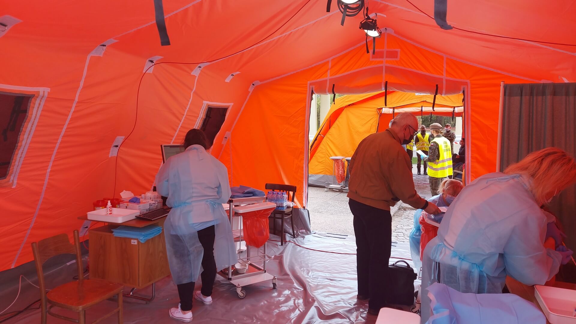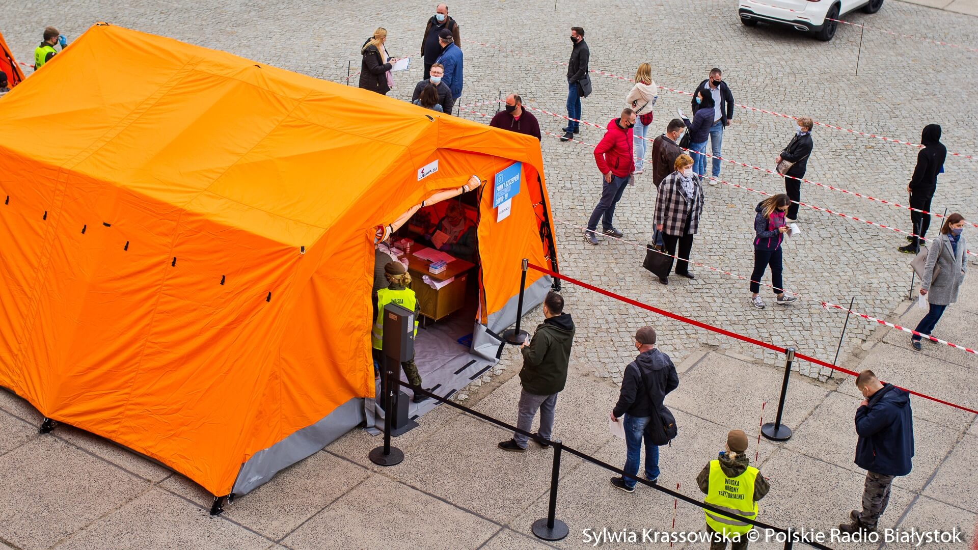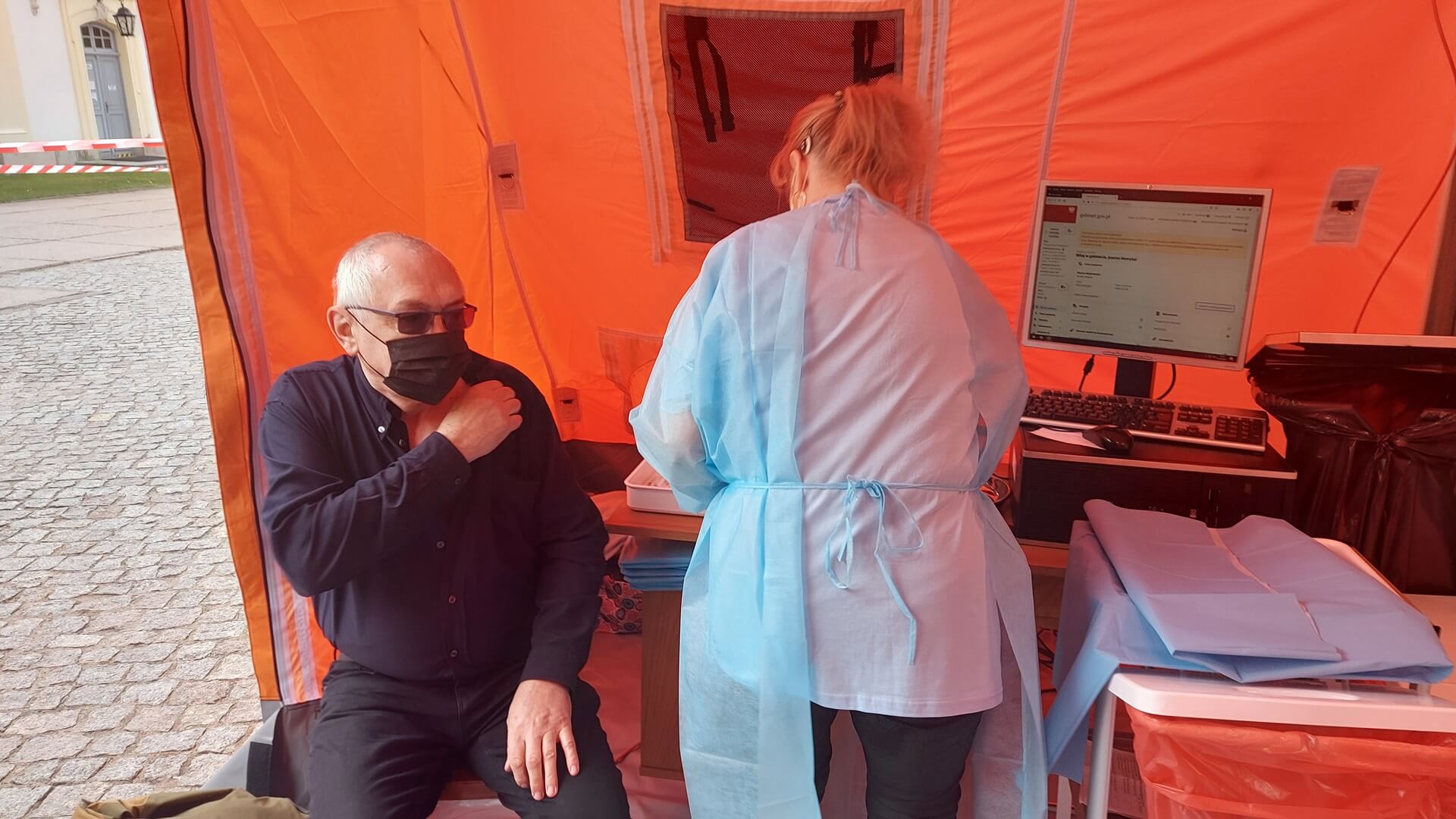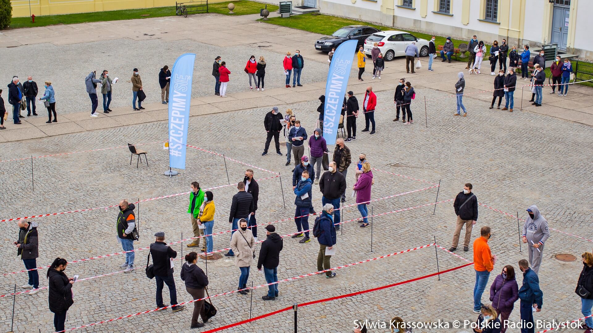 Kolejka chętnych w punkcie zlokalizowanym na dziedzińcu Pałacu Branickich w Białymstoku ustawiła się jeszcze przed godz. 10:00, dlatego pierwsze szczepienia rozpoczęto nieco wcześniej, niż planowano. W sumie pracują tam trzy zespoły (lekarz plus pielęgniarka) i rejestratorka, medykom z Uniwersyteckiego Szpitala Klinicznego (USK) w Białymstoku pomagają żołnierze WOT.