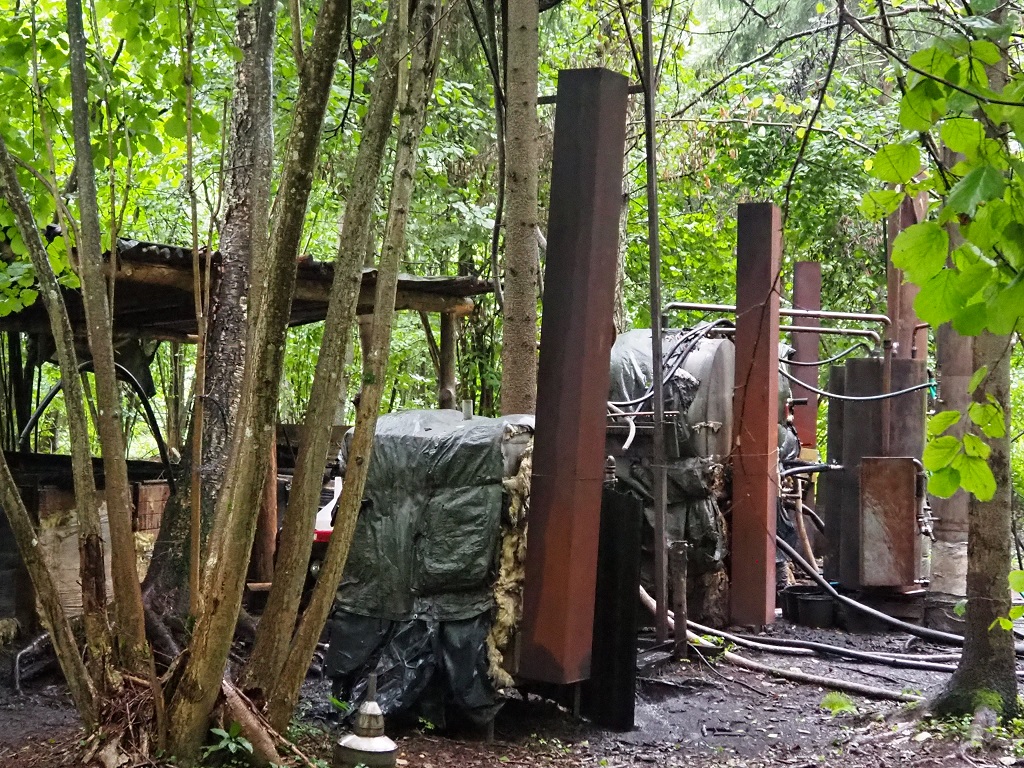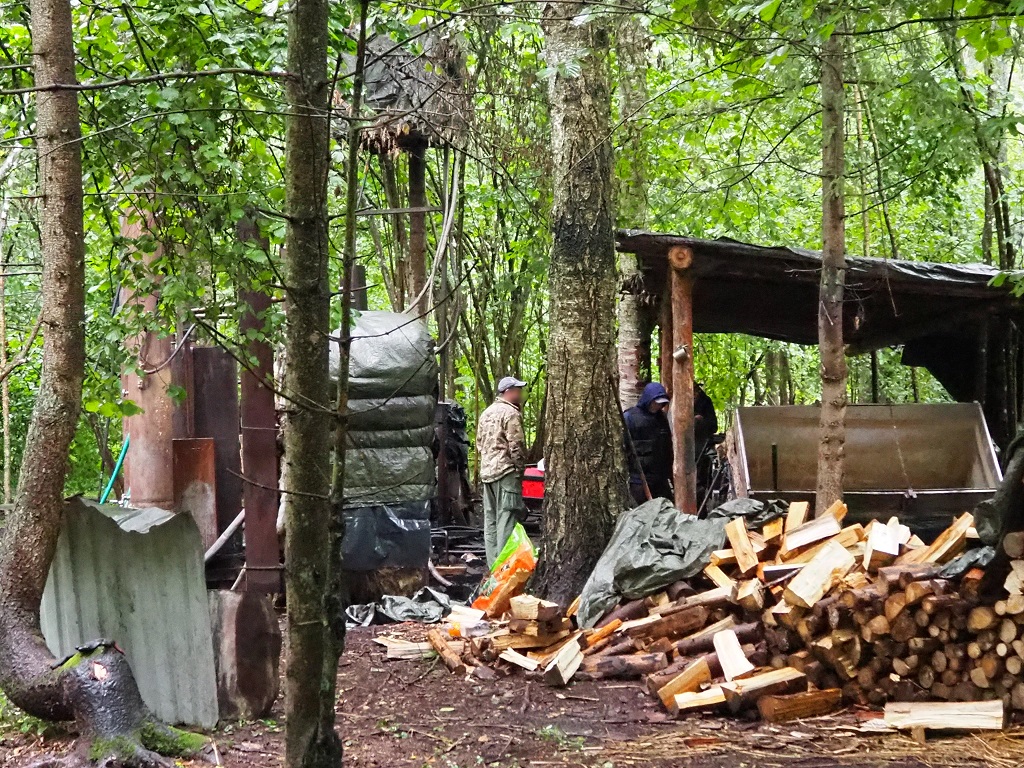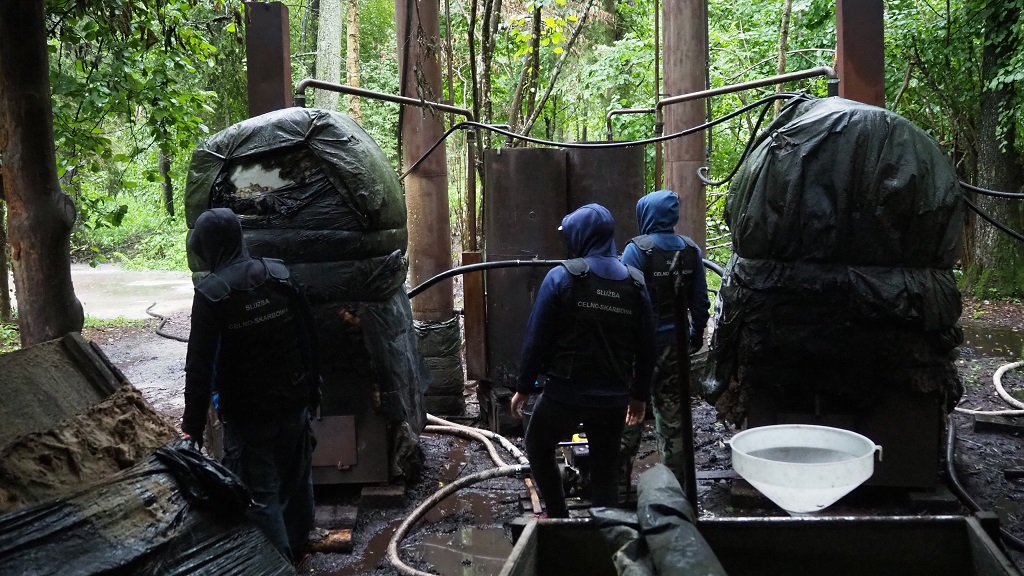 W zamaskowanej leśnej bimbrowni funkcjonariusze znaleźli m.in. kadzie na zacier, trzy piece, kotły i chłodnice wykorzystywane w produkcji bimbru oraz 150 litrów właśnie wyprodukowanego alkoholu o mocy około 55 proc. W trakcie przeszukania terenu bimbrowni funkcjonariusze odkryli też podziemny zbiornik, w którym znajdowało się kolejne niemal 550 litrów bimbru.