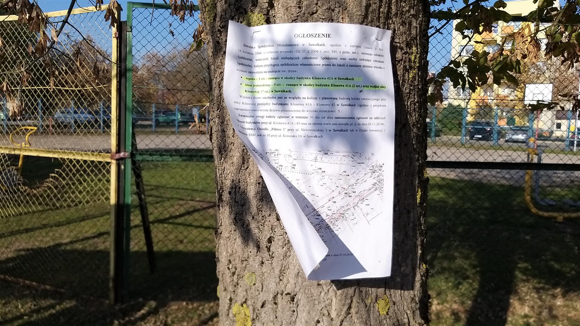Takie plany przy ulicy Klonowej ma Suwalska Spółdzielnia Mieszkaniowa. W związku modernizacją obiektu sportowego wyciętych ma tam być dziewięć klonów.