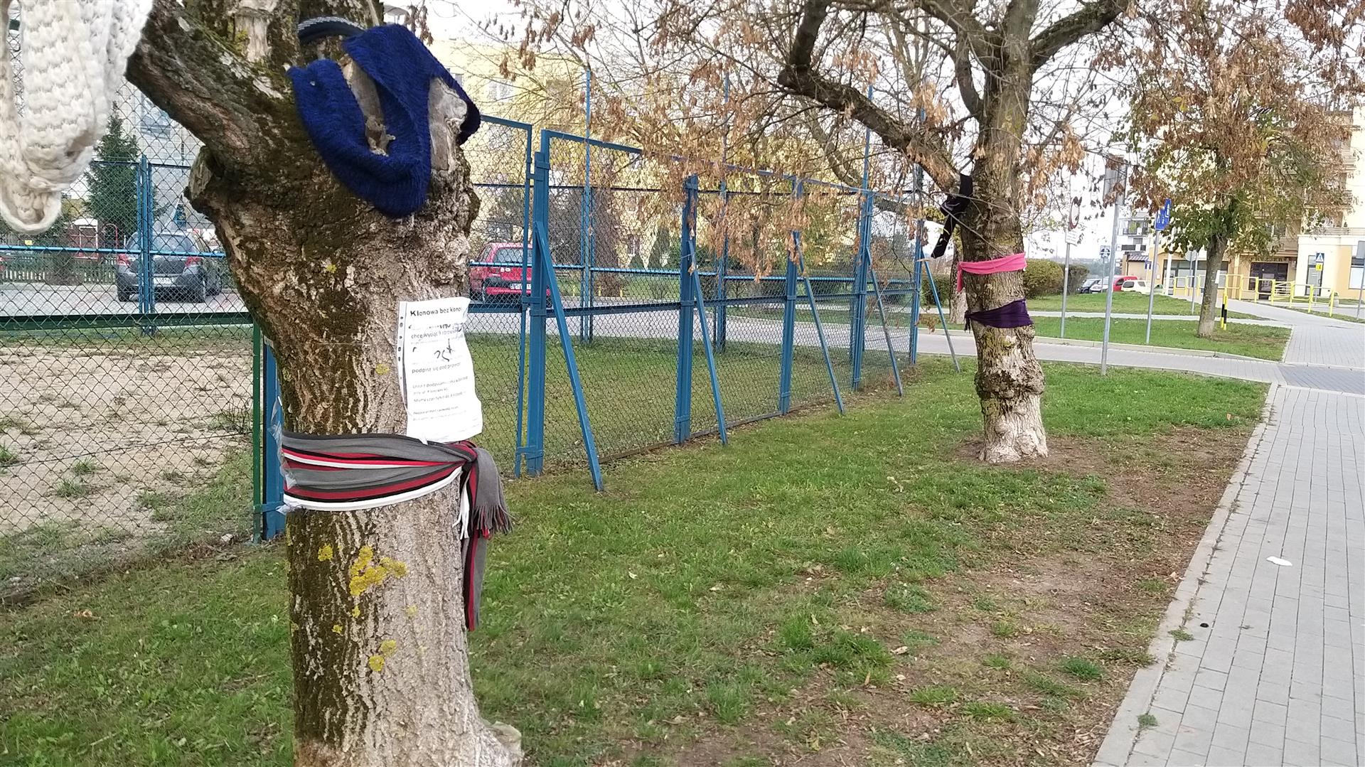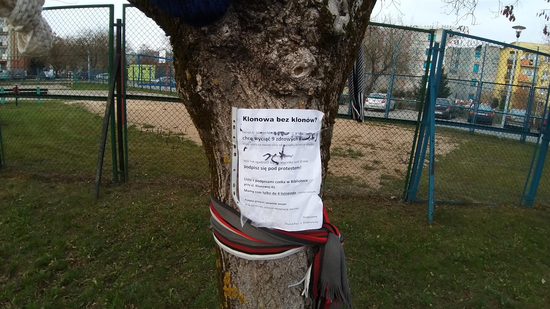 Przypomnijmy, że spółdzielnia planuje modernizację boiska przy ulicy Klonowej. Do wycięcia wskazała 10 drzew. Mieszkańcy stanęli w ich obronie. W ciągu niecałych 2 tygodni rozwiesili ulotki, ubrali drzewa w szaliki i zebrali kilkaset podpisów.
