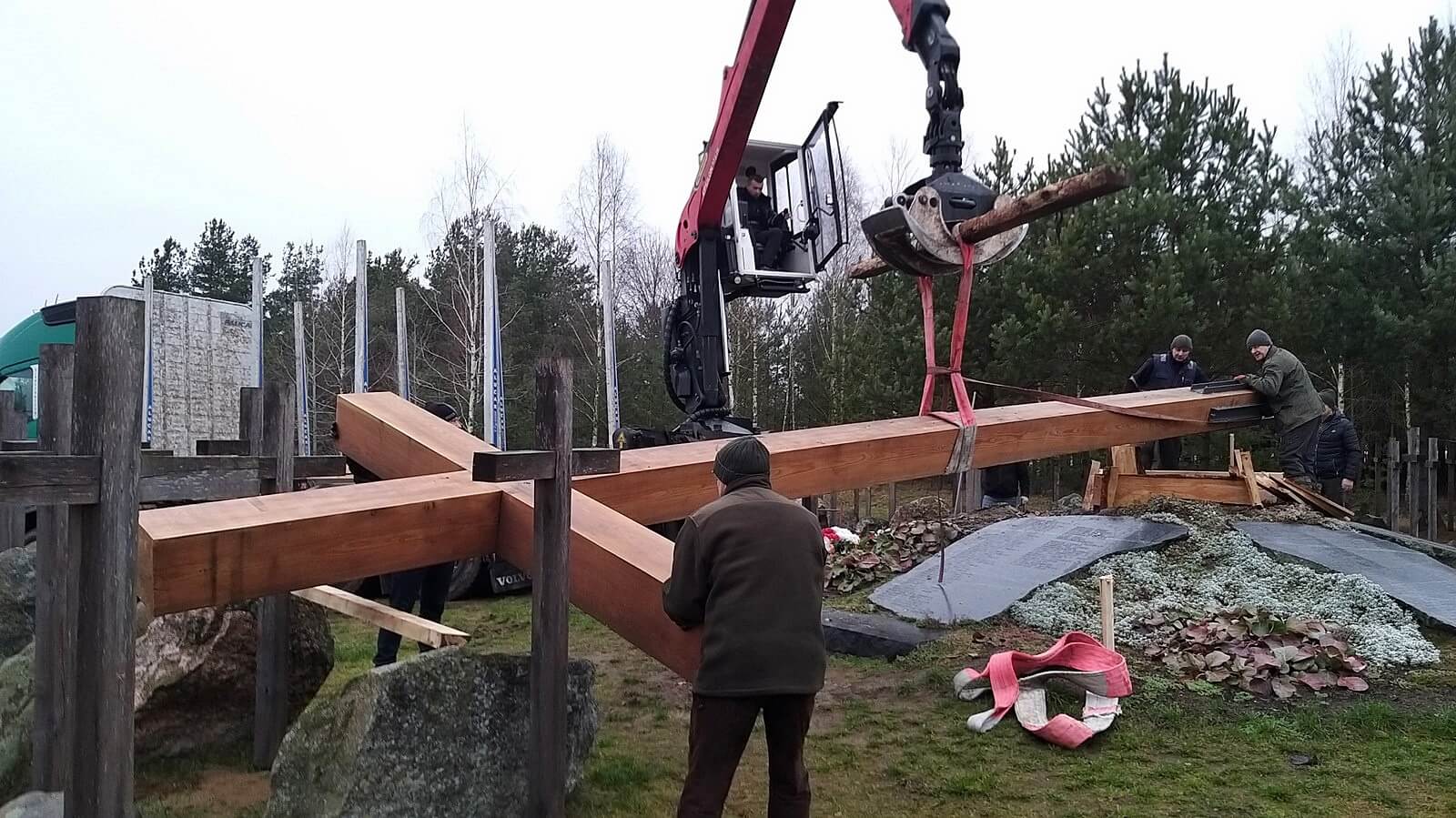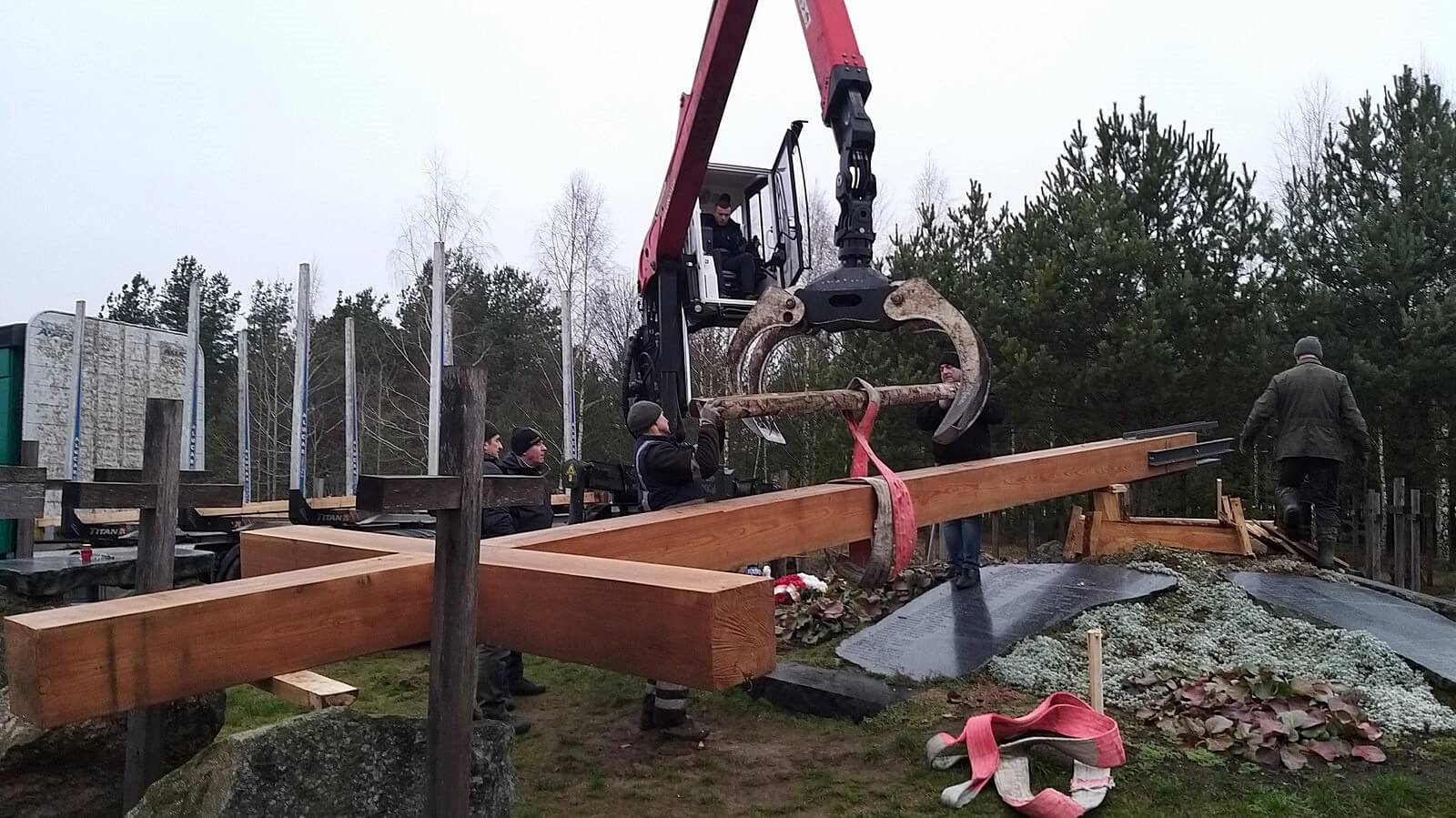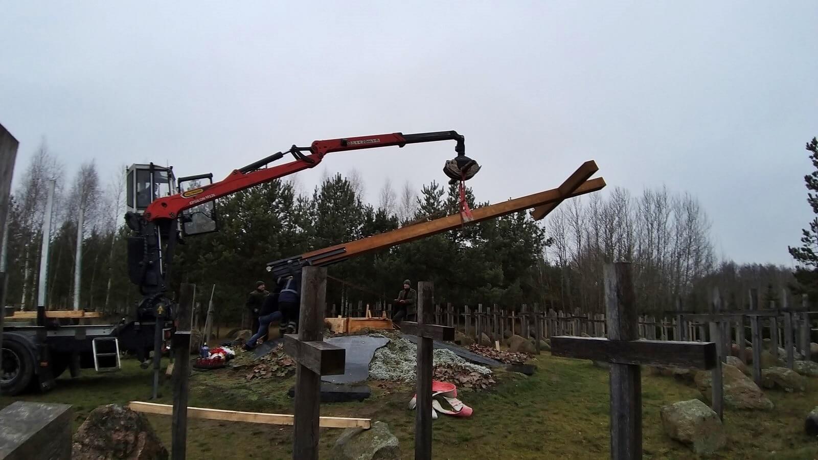 Modrzewiowy 10-metrowy krzyż waży ponad tonę. Został w sobotę ustawiony i zamontowany na zlecenie Związku Ofiar Obławy Augustowskiej 1945 roku. Robotnicy wykonują specjalną podstawę, która go utrzyma.