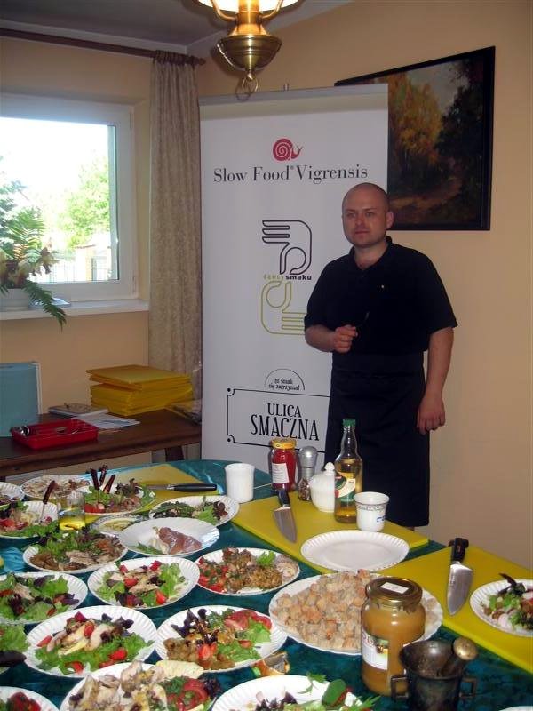 Podczas zajęć praktycznych tworzą dania, używając ekologicznych produktów. "Był jeden warunek - nie gotujemy tak jak w domu. Gotujemy to wszystko, czego normalnie w domu byśmy nie ugotowali" - mówi restaurator i pasjonata, szef Convivium Vigrensis Slow Food Polska Michał Grnyo.